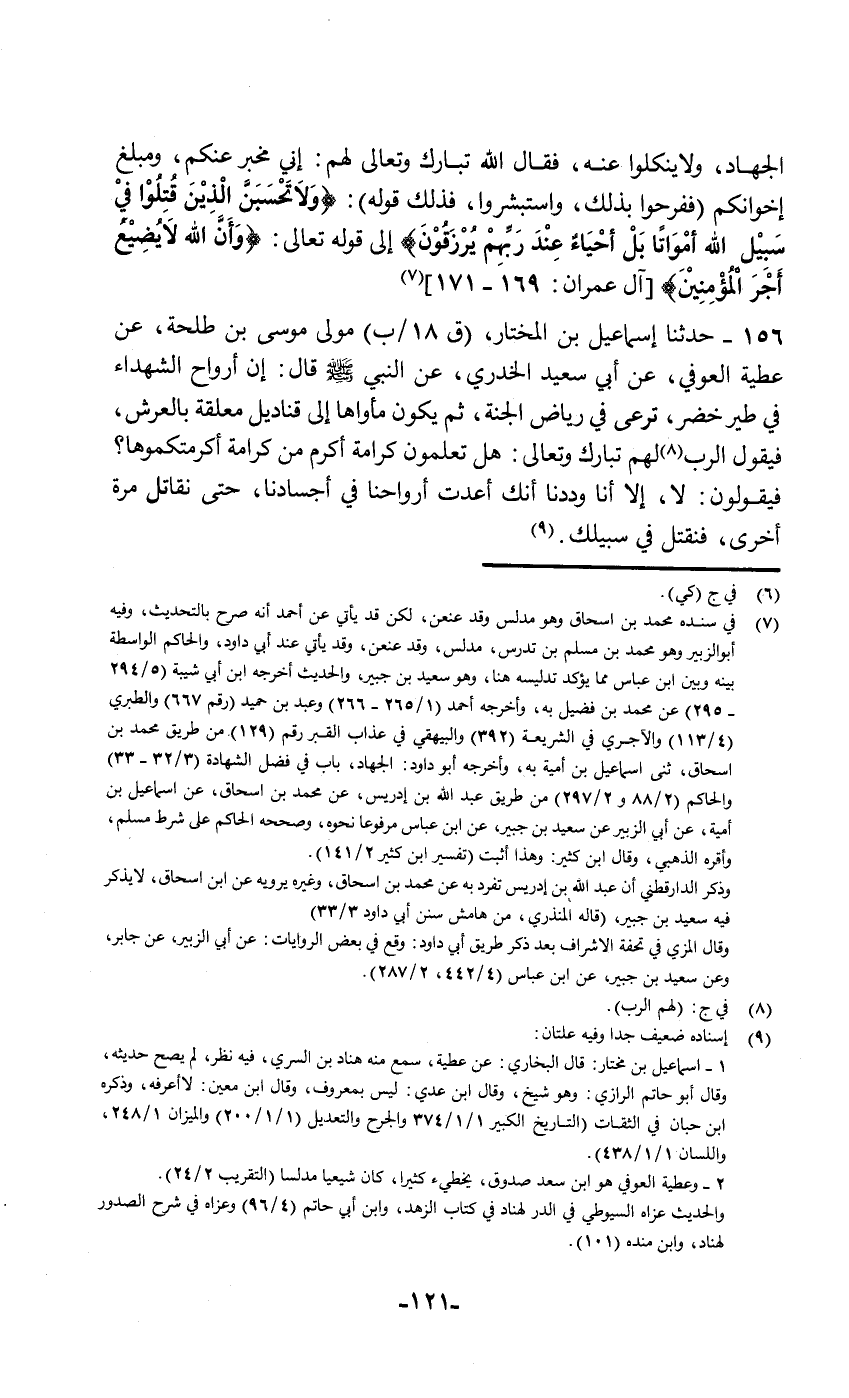 156 - حَدَّثَنَا إِسْمَاعِيلُ بْنُ الْمُخْتَارِ مَوْلَى مُوسَى بْنِ طَلْحَةَ , عَنْ عَطِيَّةَ الْعَوْفِيِّ , عَنْ أَبِي سَعِيدٍ الْخُدْرِيِّ , عَنِ النَّبِيِّ صَلَّى اللهُ عَلَيْهِ وَسَلَّمَ قَالَ: " إِنَّ §أَرْوَاحَ الشُّهَدَاءِ فِي طَيْرٍ خُضْرٍ تَرْعَى فِي رِيَاضِ الْجَنَّةِ , ثُمَّ يَكُونُ مَأْوَاهَا إِلَى قَنَادِيلَ مُعَلَّقَةٍ بِالْعَرْشِ , فَيَقُولُ الرَّبُّ لَهُمْ تَبَارَكَ وَتَعَالَى: هَلْ تَعْلَمُونَ كَرَامَةً أَكْرَمَ مِنْ كَرَامَةٍ أَكْرَمْتُكُمُوهَا؟ فَيَقُولُونَ: لَا إِلَّا أَنَّا وَدِدْنَا أَنَّكَ أَعَدْتَ أَرْوَاحَنَا فِي أَجْسَادِنَا حَتَّى نُقَاتِلَ مَرَّةً أُخْرَى فَنُقْتَلَ فِي سَبِيلِكَ "