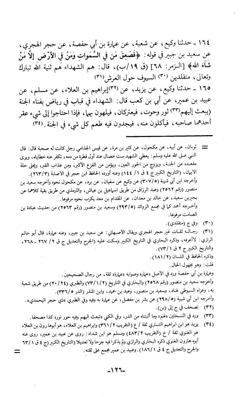 164 - حَدَّثَنَا وَكِيعٌ , عَنْ شُعْبَةَ , عَنْ عُمَارَةَ بْنِ أَبِي حَفْصَةَ , عَنْ حُجْرٍ الْهَجَرِيِّ , عَنْ سَعِيدِ بْنِ جُبَيْرٍ فِي قَوْلِهِ: §فَصَعِقَ مَنْ فِي السَّمَوَاتِ وَمَنْ فِي الْأَرْضِ إِلَّا مَنْ شَاءَ اللَّهُ قَالَ: هُمُ الشُّهَدَاءُ هُمْ ثَنِيَّةُ اللَّهِ تَبَارَكَ وَتَعَالَى مُتَقَلِّدِينَ السُّيُوفَ حَوْلَ الْعَرْشِ "