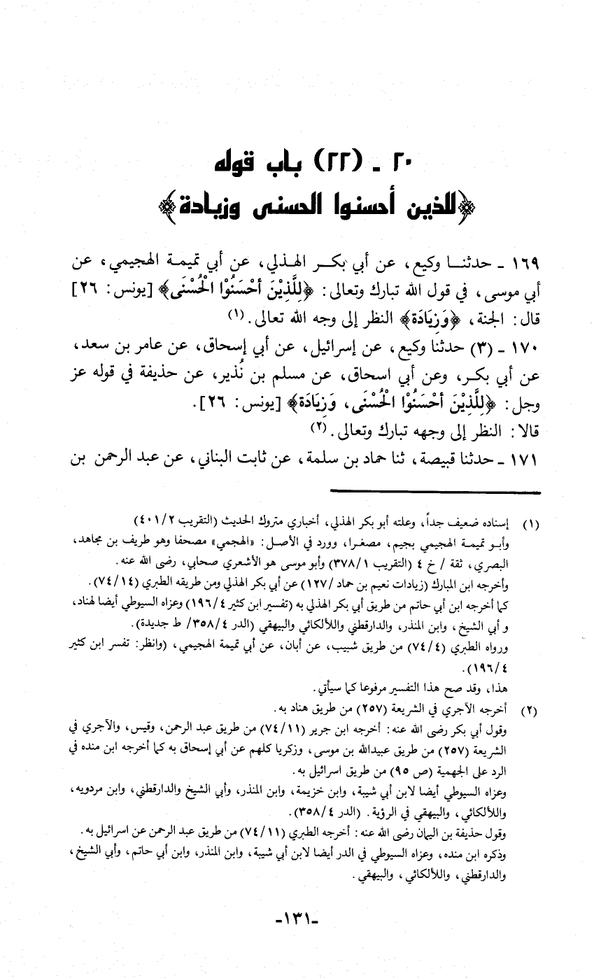 170 - حَدَّثَنَا وَكِيعٌ , عَنْ إِسْرَائِيلَ , عَنْ أَبِي إِسْحَاقَ , عَنْ عَامِرِ بْنِ سَعْدٍ , عَنْ أَبِي بَكْرٍ , وَعَنْ أَبِي إِسْحَاقَ , عَنْ مُسْلِمِ بْنِ نَذِيرٍ , عَنْ حُذَيْفَةَ فِي قَوْلِهِ عَزَّ وَجَلَّ {§لِلَّذِينَ أَحْسَنُوا الْحُسْنَى وَزِيَادَةٌ} [يونس: 26] قَالَا: «النَّظَرُ إِلَى وَجْهِهِ تَبَارَكَ وَتَعَالَى»
