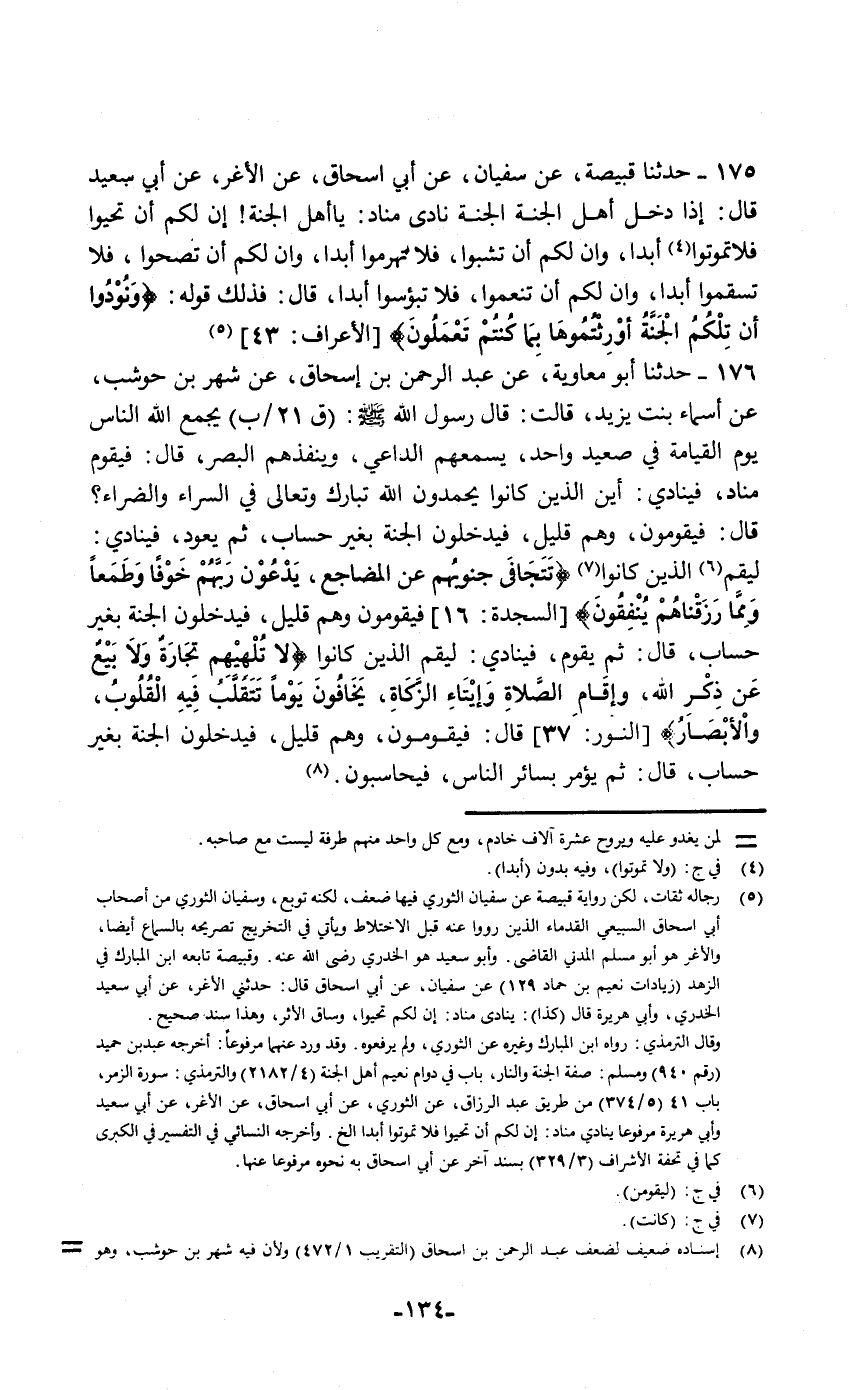 175 - حَدَّثَنَا قَبِيصَةُ , عَنْ سُفْيَانَ , عَنْ أَبِي إِسْحَاقَ , عَنِ الْأَغَرِّ , عَنْ أَبِي سَعِيدٍ قَالَ: §إِذَا دَخَلَ أَهْلُ الْجَنَّةِ الْجَنَّةَ نَادَى مُنَادٍ: يَا أَهْلَ الْجَنَّةِ , إِنَّ لَكُمْ أَنْ تَحْيَوْا فَلَا تَمُوتُوا أَبَدًا , وَإِنَّ لَكُمْ أَنْ تَشِبُّوا فَلَا تَهْرَمُوا أَبَدًا , وَإِنَّ لَكُمْ أَنْ تَصِحُّوا فَلَا تَسْقَمُوا أَبَدًا , وَإِنَّ لَكُمْ أَنْ تَنْعَمُوا فَلَا تَبْأَسُوا أَبَدًا قَالَ: فَذَلِكَ قَوْلُهُ {وَنُودُوا أَنْ تِلْكُمُ الْجَنَّةُ أُورِثْتُمُوهَا بِمَا كُنْتُمْ تَعْمَلُونَ} [الأعراف: 43] "