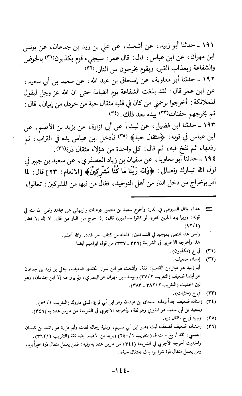 191 - حَدَّثَنَا أَبُو زُبَيْدٍ , عَنْ أَشْعَثَ , عَنْ عَلِيِّ بْنِ زَيْدِ بْنِ جُدْعَانَ , عَنْ يُونُسَ بْنِ مِهْرَانَ , عَنِ ابْنِ عَبَّاسٍ قَالَ: قَالَ عُمَرُ: «§سَيَجِيءُ قَوْمٌ يُكَذِّبُونَ بِالْحَوْضِ , وَالشَّفَاعَةِ , وَبِعَذَابِ الْقَبْرِ , وَبِقَوْمٍ يَخْرُجُونَ مِنَ النَّارِ»