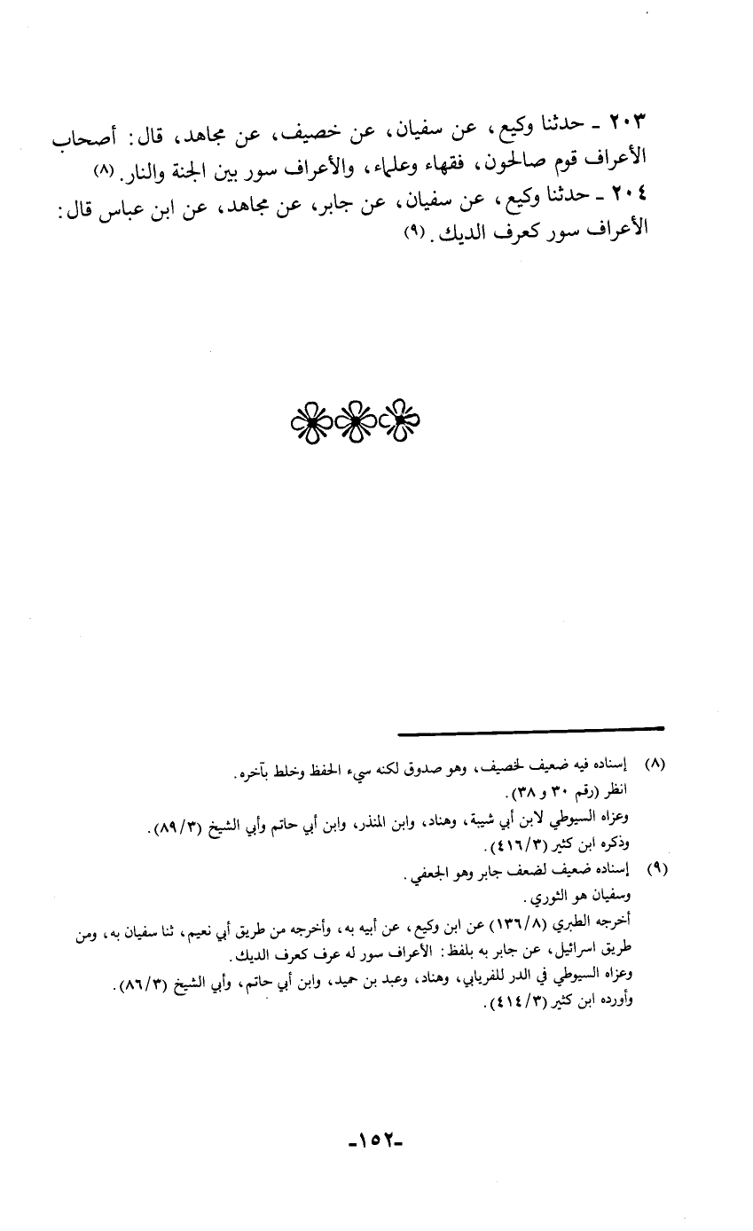203 - حَدَّثَنَا وَكِيعٌ , عَنْ سُفْيَانَ , عَنْ خُصَيْفٍ , عَنْ مُجَاهِدٍ قَالَ: «§أَصْحَابُ الْأَعْرَافِ قَوْمٌ صَالِحُونَ فُقَهَاءُ وَعُلَمَاءُ , وَالْأَعْرَافُ سُورٌ بَيْنَ الْجَنَّةِ وَالنَّارِ»