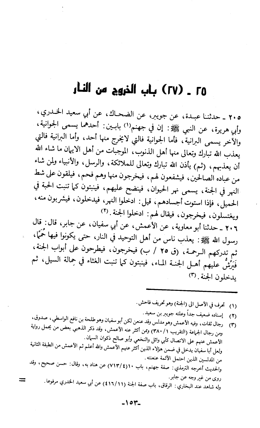 206 - حَدَّثَنَا أَبُو مُعَاوِيَةَ , عَنِ الْأَعْمَشِ , عَنْ أَبِي سُفْيَانَ , عَنْ جَابِرٍ قَالَ: قَالَ رَسُولُ اللَّهِ صَلَّى اللهُ عَلَيْهِ وَسَلَّمَ: «§يُعَذَّبُ نَاسٌ مِنْ أَهْلِ التَّوْحِيدِ فِي النَّارِ حَتَّى يَكُونُوا فِيهَا حِمَمًا ثُمَّ تُدْرِكُهُمُ الرَّحْمَةُ فَيَخْرُجُونَ فَيُطْرَحُونَ عَلَى أَبْوَابِ الْجَنَّةِ فَيَرُشُّ عَلَيْهِمْ أَهْلُ الْجَنَّةِ الْمَاءَ , فَيَنْبُتُونَ كَمَا تَنْبُتُ الْغُثَاءُ فِي حِمَالَةِ السَّيْلِ , ثُمَّ يَدْخُلُونَ الْجَنَّةَ»
