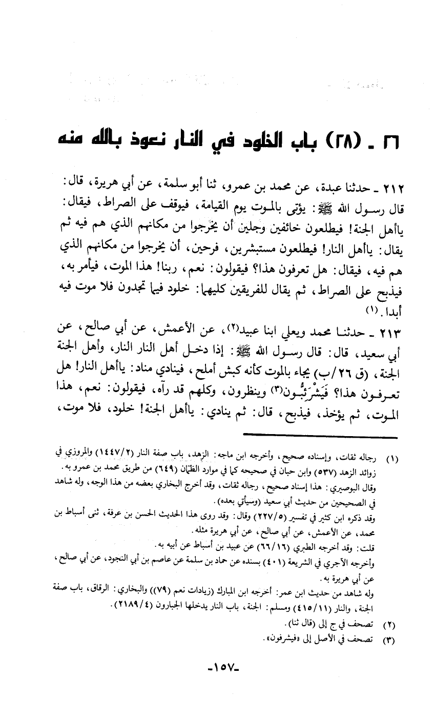 212 - حَدَّثَنَا عَبْدَةُ , عَنْ مُحَمَّدِ بْنِ عَمْرٍو , ثنا أَبُو سَلَمَةَ , عَنْ أَبِي هُرَيْرَةَ قَالَ: قَالَ رَسُولُ اللَّهِ صَلَّى اللهُ عَلَيْهِ وَسَلَّمَ: " §يُؤْتَى بِالْمَوْتِ يَوْمَ الْقِيَامَةِ فَيُوقَفُ عَلَى الصِّرَاطِ , فَيُقَالُ: يَا أَهْلَ الْجَنَّةِ , فَيَطَّلِعُونَ خَائِفِينَ وَجِلِينَ أَنْ يَخْرُجُوا مِنْ مَكَانِهِمُ الَّذِي هُمْ فِيهِ , ثُمَّ يُقَالُ: يَا أَهْلَ النَّارِ فَيَطَّلِعُونَ مُسْتَبْشِرِينَ فَرِحِينَ أَنْ يُخْرَجُوا مِنْ مَكَانِهِمُ الَّذِي هُمْ فِيهِ , فَيُقَالُ: هَلْ تَعْرِفُونَ هَذَا؟ فَيَقُولُونَ: نَعَمْ , رَبَّنَا هَذَا الْمَوْتُ , فَيَأْمُرُ بِهِ فَيُذْبَحُ عَلَى الصِّرَاطِ , ثُمَّ يُقَالُ لِلْفَرِيقَيْنِ كِلَيْهِمَا: خُلُودٌ فِيمَا تَجِدُونَ فَلَا مَوْتَ فِيهِ أَبَدًا "