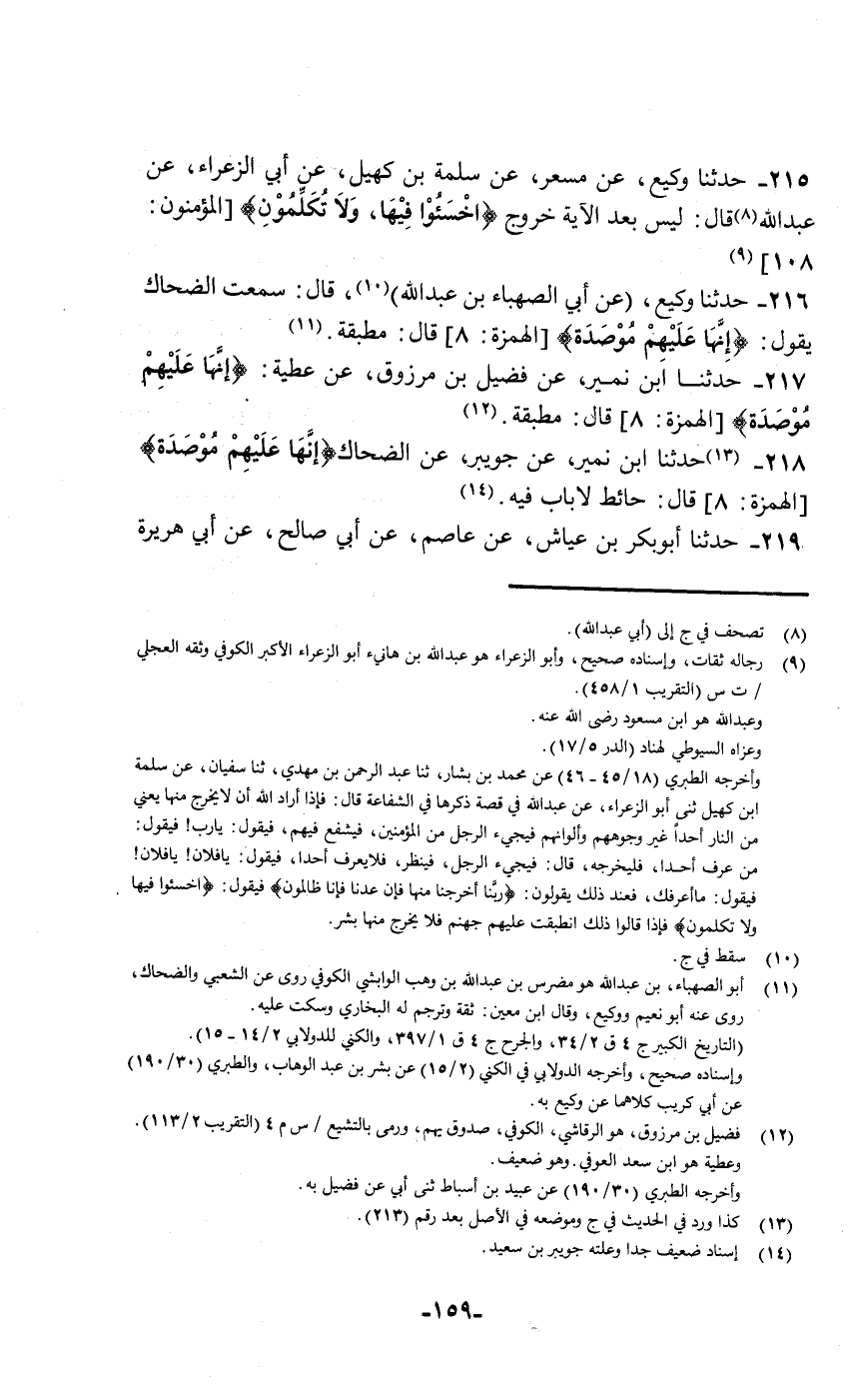 215 - حَدَّثَنَا وَكِيعٌ , عَنْ مِسْعَرٍ , عَنْ سَلَمَةَ بْنِ كُهَيْلٍ , عَنْ أَبِي الزَّعْرَاءِ , عَنْ عَبْدِ اللَّهِ قَالَ: «§لَيْسَ بَعْدَ الْآيَةِ خُرُوجٌ {اخْسَئُوا فِيهَا وَلَا تُكَلِّمُونِ} »