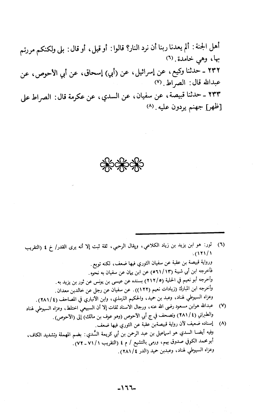 233 - حَدَّثَنَا قَبِيصَةُ , عَنْ سُفْيَانَ , عَنِ السُّدِّيِّ , عَنْ عِكْرِمَةَ قَالَ: «§الصِّرَاطُ عَلَى ظَهْرِ جَهَنَّمَ يَرِدُونَ عَلَيْهِ»