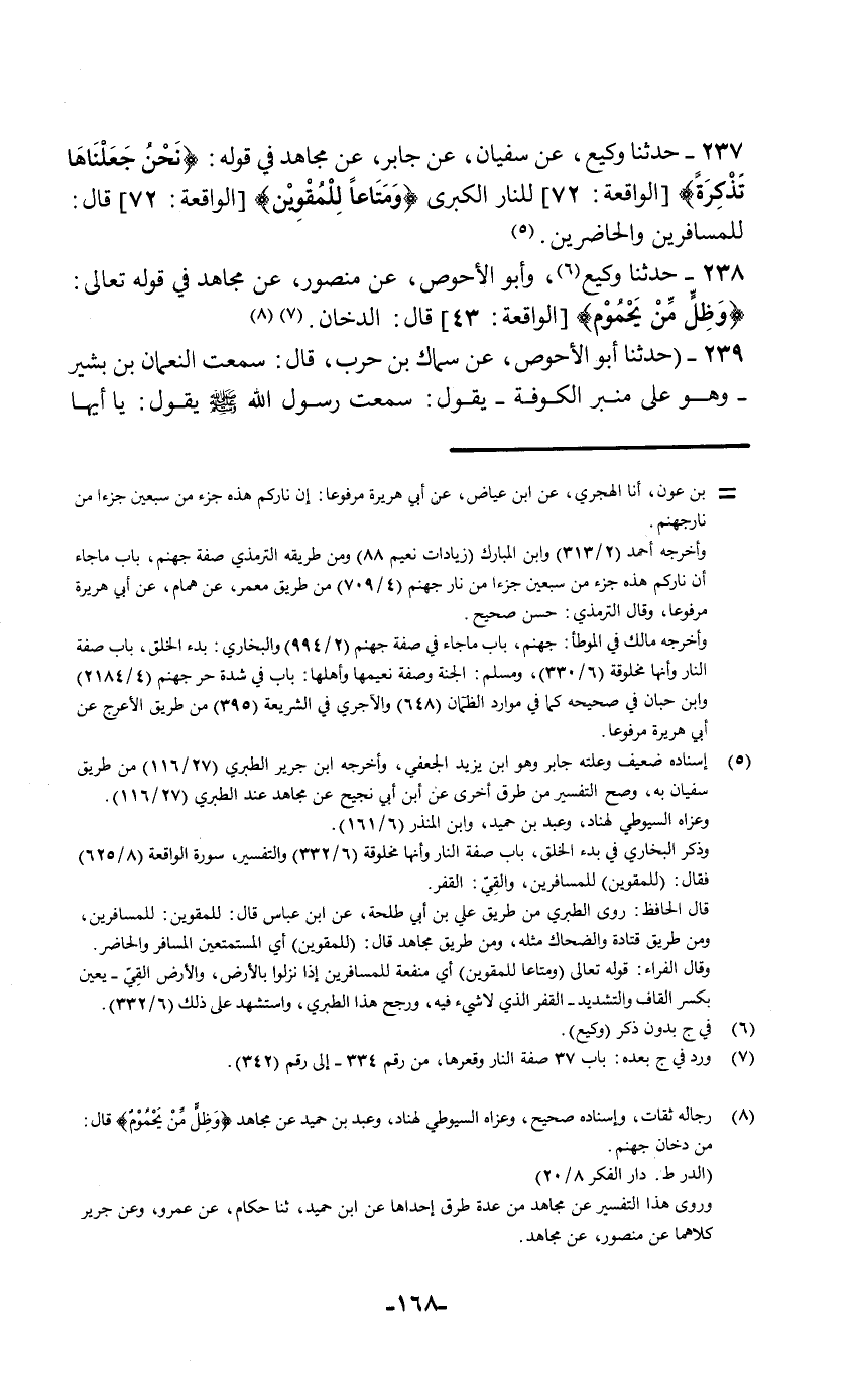 238 - حَدَّثَنَا وَكِيعٌ , وَأَبُو الْأَحْوَصِ , عَنْ مَنْصُورٍ , عَنْ مُجَاهِدٍ فِي قَوْلِهِ تَعَالَى: {§وَظِلٍّ مِنْ يَحْمُومٍ} [الواقعة: 43] قَالَ: «الدُّخَانُ»