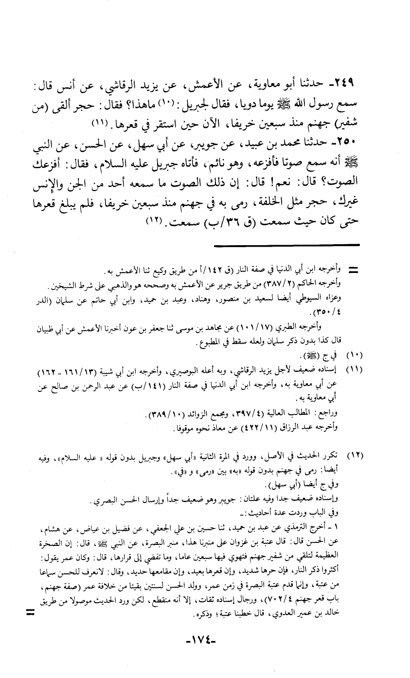 249 - حَدَّثَنَا أَبُو مُعَاوِيَةَ , عَنِ الْأَعْمَشِ , عَنْ يَزِيدَ الرَّقَاشِيِّ , عَنْ أَنَسٍ قَالَ: سَمِعَ رَسُولَ اللَّهِ صَلَّى اللهُ عَلَيْهِ وَسَلَّمَ يَوْمًا دَوِيًّا , فَقَالَ لِجِبْرِيلَ: «مَا هَذَا» ؟ فَقَالَ: §حَجَرٌ أُلْقِيَ مِنْ شَفِيرِ جَهَنَّمَ مُنْذُ سَبْعِينَ خَرِيفًا الْآنَ حِينَ اسْتَقَرَّ فِي قَعْرِهَا "