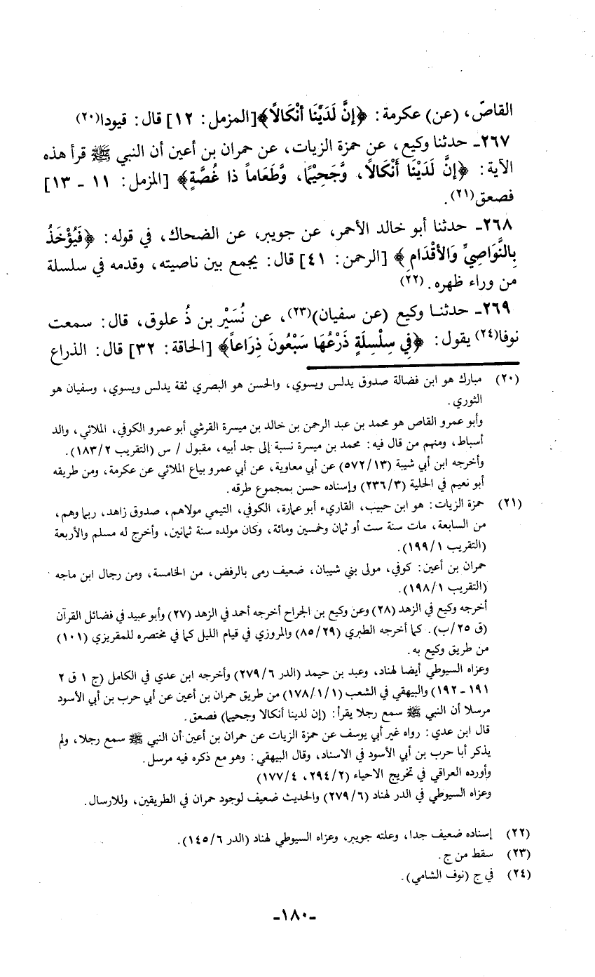 269 - حَدَّثَنَا وَكِيعٌ , عَنْ سُفْيَانَ , عَنْ نُسَيْرِ بْنِ ذُعْلُوقٍ قَالَ: سَمِعْتُ نَوْفًا يَقُولُ: {§فِي سِلْسِلَةٍ ذَرْعُهَا سَبْعُونَ ذِرَاعًا} [الحاقة: 32] قَالَ: الذِّرَاعُ -[181]- سَبْعُونَ بَاعًا , وَالْبَاعُ مَا بَيْنَكَ وَبَيْنَ مَكَّةَ "
