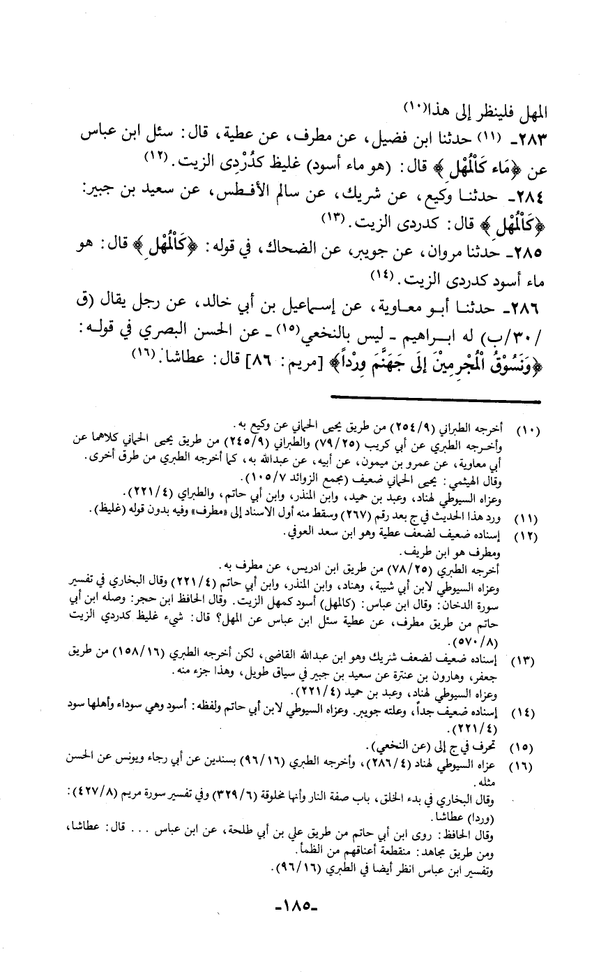 283 - حَدَّثَنَا ابْنُ فُضَيْلٍ , عَنْ مُطَرِّفٍ , عَنْ عَطِيَّةَ قَالَ: سُئِلَ ابْنُ عَبَّاسٍ عَنْ {§مَاءٍ كَالْمُهْلِ} قَالَ: «هُوَ مَاءٌ أَسْوَدُ غَلِيظٌ كَدُرْدِيِّ الزَّيْتِ»