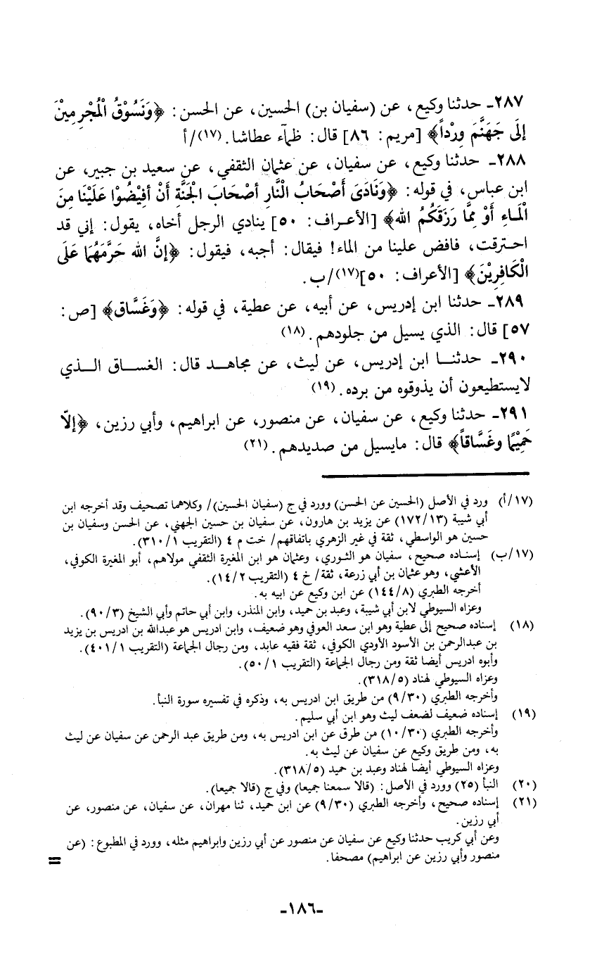 291 - حَدَّثَنَا وَكِيعٌ , عَنْ سُفْيَانَ , عَنْ مَنْصُورٍ , عَنْ إِبْرَاهِيمَ , وَأَبِي رَزِينٍ {§إِلَّا حَمِيمًا} [النبأ: 25] وَغَسَّاقًا قَالَ: «مَا يَسِيلُ مِنْ صَدِيدِهِمْ»
