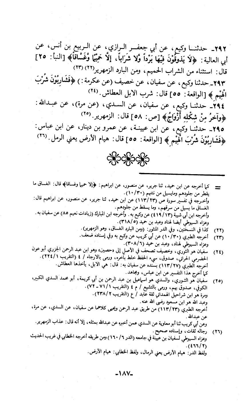 293 - حَدَّثَنَا وَكِيعٌ , عَنْ سُفْيَانَ , عَنْ خُصَيْفٍ , عَنْ عِكْرِمَةَ: {§فَشَارِبُونَ شُرْبَ الْهِيمِ} [الواقعة: 55] قَالَ: «شُرْبَ الْإِبِلِ الْعِطَاشِ»