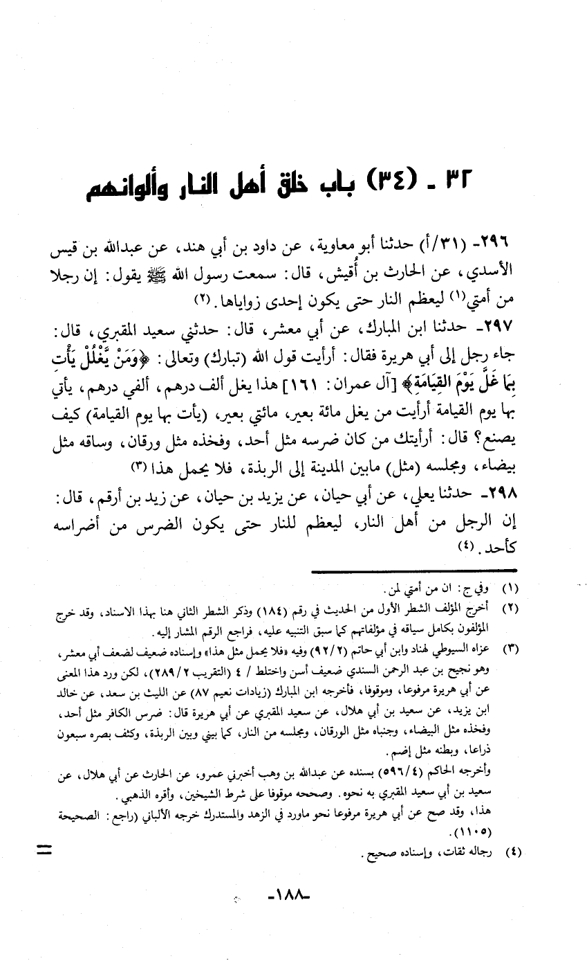 298 - حَدَّثَنَا يَعْلَى , عَنْ أَبِي حَيَّانَ , عَنْ يَزِيدَ بْنِ حَيَّانَ , عَنْ زَيْدِ بْنِ أَرْقَمَ قَالَ: «إِنَّ §الرَّجُلَ مِنْ أَهْلِ النَّارِ لَيُعَظِّمُ لِلنَّارِ حَتَّى يَكُونَ الضِّرْسُ مِنْ أَضْرَاسِهِ كَأُحُدٍ»