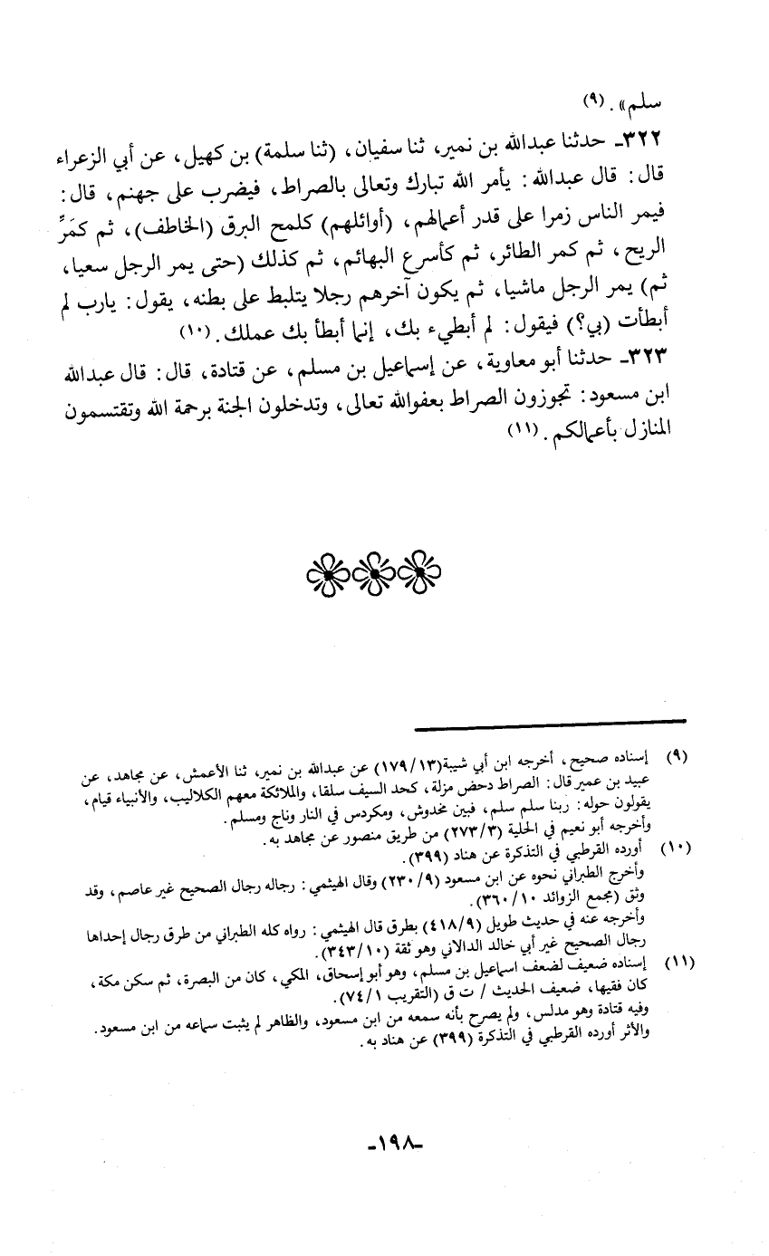 322 - حَدَّثَنَا عَبْدُ اللَّهِ بْنُ نُمَيْرٍ , ثنا سُفْيَانُ , ثنا سَلَمَةُ بْنُ كُهَيْلٍ , عَنْ أَبِي الزَّعْرَاءِ قَالَ: قَالَ عَبْدُ اللَّهِ: " §يَأْمُرُ اللَّهُ تَبَارَكَ وَتَعَالَى بِالصِّرَاطِ فَيُضْرَبُ عَلَى جَهَنَّمَ، قَالَ: فَيَمُرُّ النَّاسُ زُمَرًا عَلَى قَدْرِ أَعْمَالِهِمْ , أَوَائِلُهُمْ كَلَمْحِ الْبَرْقِ الْخَاطِفِ , ثُمَّ كَمَرِّ الرِّيحِ , ثُمَّ كَمَرِّ الطَّائِرِ , ثُمَّ كَأَسْرَعِ الْبَهَائِمِ , ثُمَّ كَذَلِكَ حَتَّى يَمُرَّ الرَّجُلُ سَعْيًا , ثُمَّ يَمُرُّ الرَّجُلُ مَاشِيًا , ثُمَّ يَكُونُ آخِرُهُمْ رَجُلًا يَتَلَبَّطُ عَلَى بَطْنِهِ يَقُولُ: يَا رَبِّ , لِمَ أَبْطَأْتَ بِي؟ فَيَقُولُ: لَمْ أُبْطِئْ بِكَ , إِنَّمَا أَبْطَأَ بِكَ عَمَلُكَ