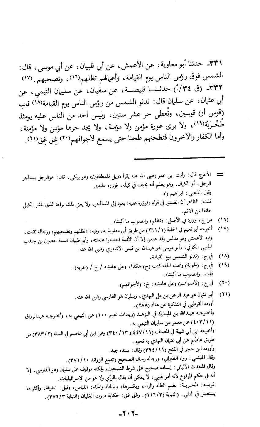 331 - حَدَّثَنَا أَبُو مُعَاوِيَةَ , عَنِ الْأَعْمَشِ , عَنْ أَبِي ظَبْيَانَ , عَنْ أَبِي مُوسَى قَالَ: «§الشَّمْسُ فَوْقَ رُءُوسِ النَّاسِ يَوْمَ الْقِيَامَةِ وَأَعْمَالُهُمْ تُظِلُّهُمْ وَتَصْحَبُهُمْ»
