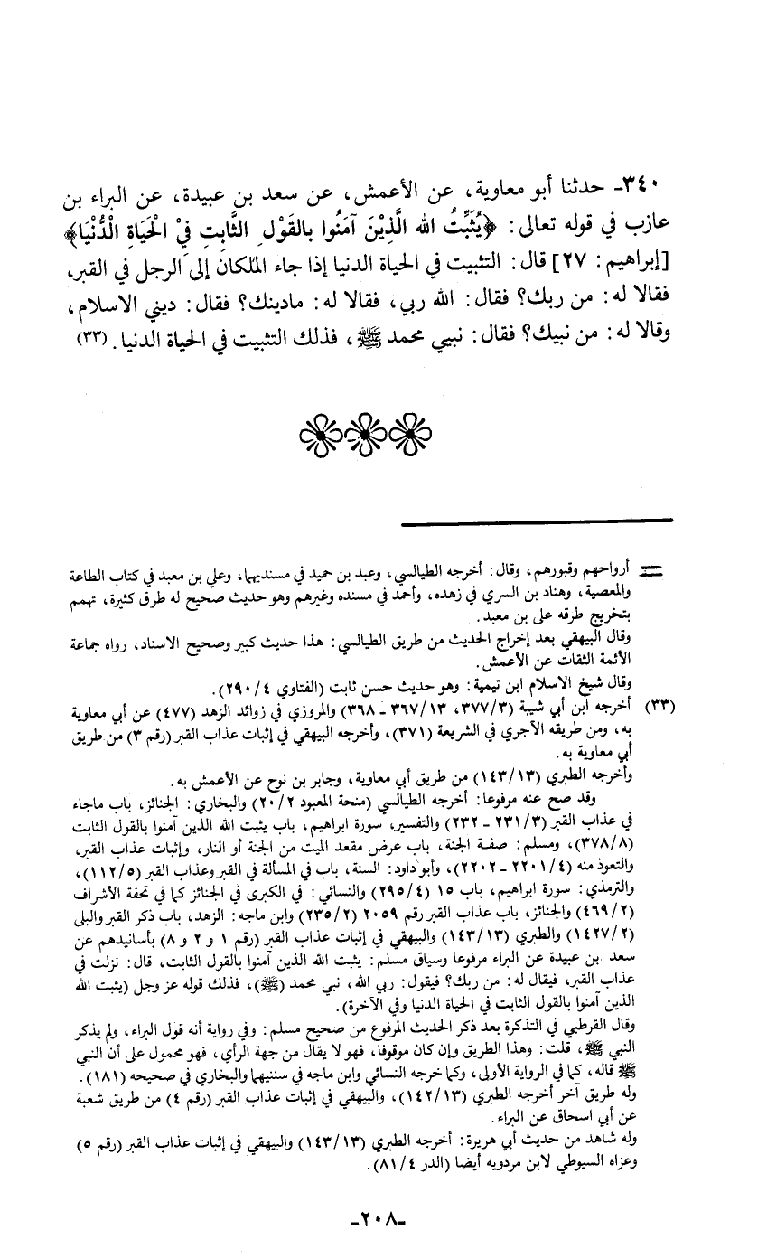 340 - حَدَّثَنَا أَبُو مُعَاوِيَةَ , عَنِ الْأَعْمَشِ , عَنْ سَعْدِ بْنِ عُبَيْدَةَ , عَنِ الْبَرَاءِ بْنِ عَازِبٍ فِي قَوْلِهِ تَعَالَى: {§يُثَبِّتُ اللَّهُ الَّذِينَ آمَنُوا بِالْقَوْلِ الثَّابِتِ فِي الْحَيَاةِ الدُّنْيَا} [إبراهيم: 27] قَالَ: " التَّثْبِيتُ فِي الْحَيَاةِ الدُّنْيَا إِذَا جَاءَ الْمَلَكَانِ إِلَى الرَّجُلِ فِي الْقَبْرِ , فَقَالَا لَهُ: مَنْ رَبُّكَ؟ فَقَالَ: اللَّهُ رَبِّي , فَقَالَا لَهُ: مَا دِينُكَ؟ فَقَالَ: دِينِي الْإِسْلَامُ , وَقَالَا لَهُ: مَنْ نَبِيُّكَ؟ فَقَالَ: نَبِيِّي مُحَمَّدٌ صَلَّى اللهُ عَلَيْهِ وَسَلَّمَ. فَذَلِكَ التَّثْبِيتُ فِي الْحَيَاةِ الدُّنْيَا "