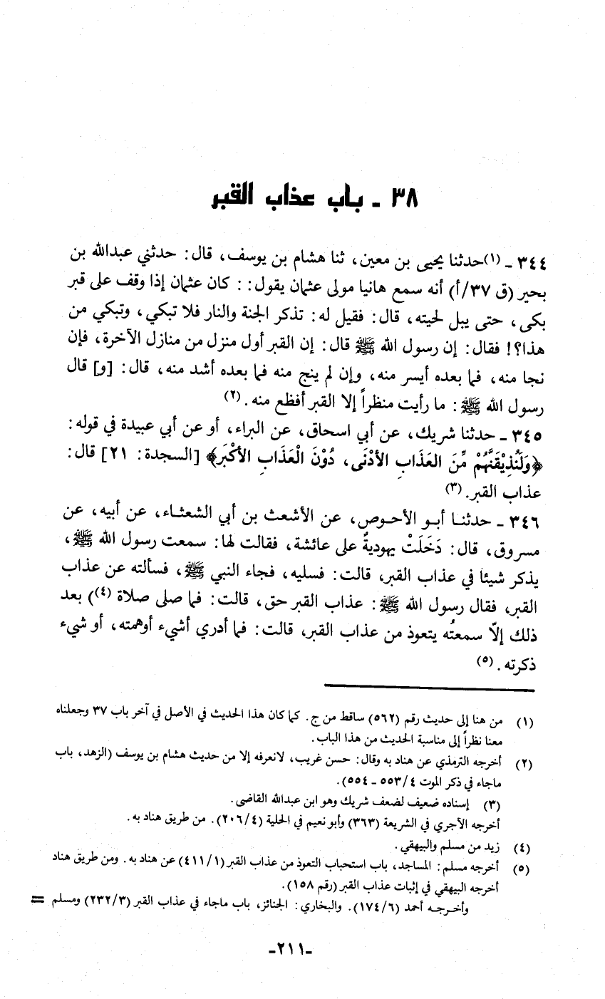 346 - حَدَّثَنَا أَبُو الْأَحْوَصِ , عَنِ الْأَشْعَثِ بْنِ أَبِي الشَّعْثَاءِ , عَنْ أَبِيهِ , عَنْ مَسْرُوقٍ قَالَ: دَخَلَتْ يَهُودِيَّةٌ عَلَى عَائِشَةَ , فَقَالَتْ لَهَا: سَمِعْتِ رَسُولَ اللَّهِ صَلَّى اللهُ عَلَيْهِ وَسَلَّمَ يَذْكُرُ شَيْئًا فِي عَذَابِ الْقَبْرِ؟ قَالَتْ: فَسَلِيهِ , فَجَاءَ النَّبِيُّ صَلَّى اللهُ عَلَيْهِ وَسَلَّمَ فَسَأَلَتْهُ عَنْ عَذَابِ الْقَبْرِ , فَقَالَ رَسُولُ اللَّهِ صَلَّى اللهُ عَلَيْهِ وَسَلَّمَ: «§عَذَابُ الْقَبْرِ حَقٌّ» قَالَتْ: فَمَا صَلَّى صَلَاةً بَعْدَ ذَلِكَ إِلَّا سَمِعْتُهُ يَتَعَوَّذُ مِنْ عَذَابِ الْقَبْرِ قَالَتْ: فَمَا أَدْرِي أَشَيْءٌ أُوهِمْتُهُ أَوْ شَيْءٌ ذَكَرْتُهُ