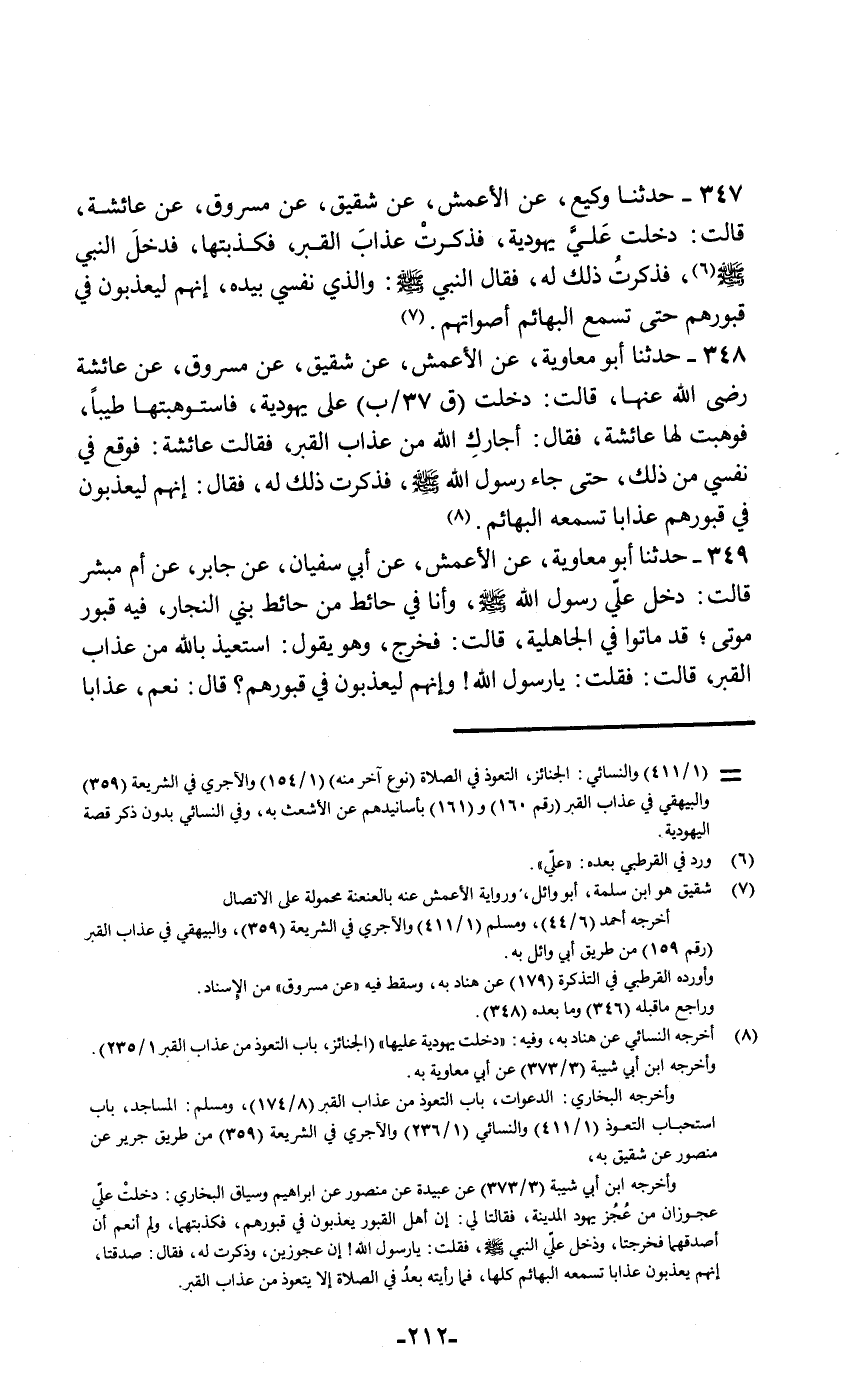 347 - حَدَّثَنَا وَكِيعٌ , عَنِ الْأَعْمَشِ , عَنْ شَقِيقٍ , عَنْ مَسْرُوقٍ , عَنْ عَائِشَةَ قَالَتْ: دَخَلَتْ عَلَيَّ يَهُودِيَّةٌ , فَذَكَرَتْ عَذَابَ الْقَبْرِ فَكَذَّبْتُهَا , فَدَخَلَ النَّبِيُّ صَلَّى اللهُ عَلَيْهِ وَسَلَّمَ فَذَكَرْتُ ذَلِكَ لَهُ , فَقَالَ النَّبِيُّ صَلَّى اللهُ عَلَيْهِ وَسَلَّمَ: «وَالَّذِي نَفْسِي بِيَدِهِ §إِنَّهُمْ لَيُعَذَّبُونَ فِي قُبُورِهِمْ حَتَّى تَسْمَعَ الْبَهَائِمُ أَصْوَاتَهُمْ»