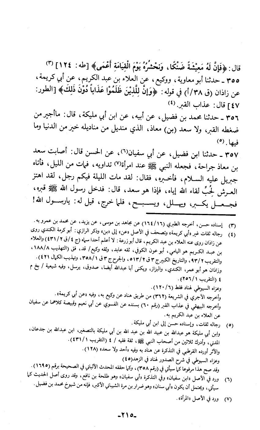 357 - حَدَّثَنَا ابْنُ فُضَيْلٍ , عَنْ أَبِي سُفْيَانَ , عَنِ الْحَسَنِ قَالَ: أَصَابَتْ سَعْدَ بْنَ مُعَاذٍ جِرَاحَةٌ , فَجَعَلَهُ النَّبِيُّ صَلَّى اللهُ عَلَيْهِ وَسَلَّمَ عِنْدَ امْرَأَةٍ تُدَاوِيهِ , فَمَاتَ مِنَ اللَّيْلِ , فَأَتَاهُ جِبْرِيلُ عَلَيْهِ السَّلَامُ فَأَخْبَرَهُ , فَقَالَ: §لَقَدْ مَاتَ اللَّيْلَةَ فِيكُمْ رَجُلٌ لَقَدِ اهْتَزَّ الْعَرْشُ لِحُبِّ لِقَاءِ اللَّهِ إِيَّاهُ فَإِذَا هُوَ سَعْدٌ قَالَ: فَدَخَلَ رَسُولُ اللَّهِ صَلَّى اللهُ عَلَيْهِ وَسَلَّمَ قَبْرَهُ , فَجَعَلَ يُكَبِّرُ وَيُهَلِّلُ وَيُسَبِّحُ , فَلَمَّا خَرَجَ قِيلَ لَهُ: يَا رَسُولَ اللَّهِ -[216]- مَا رَأَيْنَاكَ صَنَعْتَ هَكَذَا قَطُّ قَالَ: «إِنَّهُ ضُمَّ فِي الْقَبْرِ ضَمَّةً حَتَّى صَارَ مِثْلَ الشَّعْرَةِ , فَدَعَوْتُ اللَّهَ أَنْ يُرَفَّهَ عَنْهُ ذَلِكَ , وَذَلِكَ أَنَّهُ كَانَ لَا يَسْتَبْرِئُ مِنَ الْبَوْلِ»