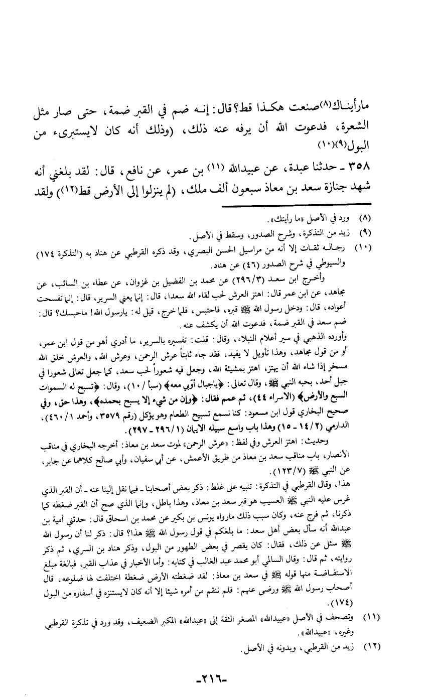 358 - حَدَّثَنَا عَبْدَةُ , عَنْ عُبَيْدِ اللَّهِ بْنِ عُمَرَ , عَنْ نَافِعٍ قَالَ: لَقَدْ بَلَغَنِي أَنَّهُ شَهِدَ جِنَازَةَ سَعْدِ بْنِ مُعَاذٍ سَبْعُونَ أَلْفَ مَلَكٍ لَمْ يَنْزِلُوا إِلَى الْأَرْضِ قَطُّ , وَلَقَدْ -[217]- بَلَغَنِي أَنَّ رَسُولَ اللَّهِ صَلَّى اللهُ عَلَيْهِ وَسَلَّمَ قَالَ: «§لَقَدْ ضُمَّ صَاحِبُكُمْ فِي الْقَبْرِ ضَمَّةً»