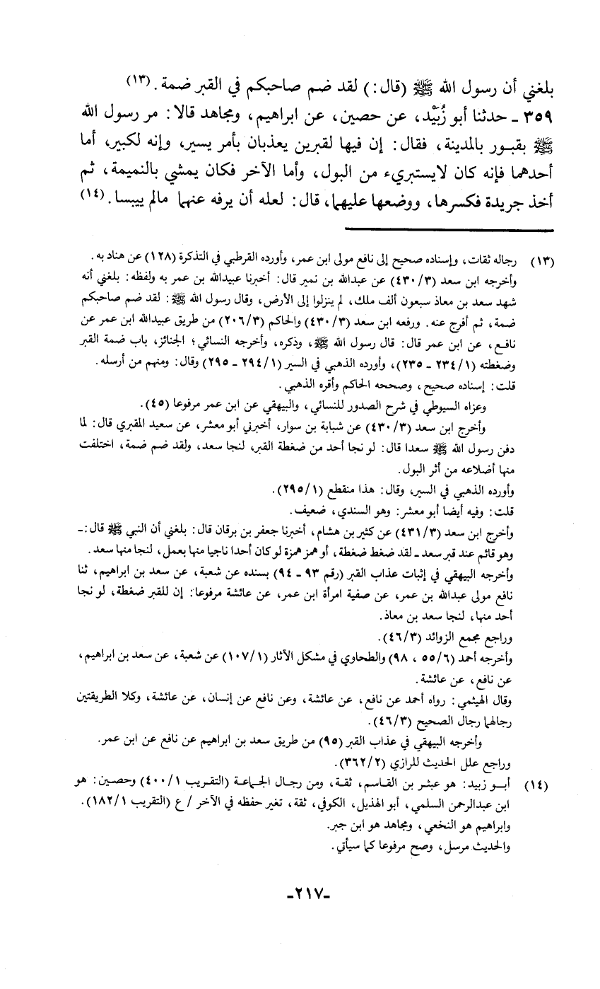 359 - حَدَّثَنَا أَبُو زُبَيْدٍ , عَنْ حُصَيْنٍ , عَنْ إِبْرَاهِيمَ , وَمُجَاهِدٍ قَالَا: مَرَّ رَسُولُ اللَّهِ صَلَّى اللهُ عَلَيْهِ وَسَلَّمَ بِقُبُورِ بِالْمَدِينَةِ , فَقَالَ: «إِنَّ فِيهَا لَقَبْرَيْنِ يُعَذَّبَانِ بِأَمْرٍ يَسِيرٍ وَإِنَّهُ لَكَبِيرٌ , أَمَّا أَحَدُهُمَا فَإِنَّهُ كَانَ لَا يَسْتَبْرِئُ مِنَ الْبَوْلِ , وَأَمَّا الْآخَرُ فَكَانَ يَمْشِي بِالنَّمِيمَةِ» , ثُمَّ أَخَذَ جَرِيدَةً فَكَسَرَهَا وَوَضَعَهَا عَلَيْهِمَا قَالَ: «§لَعَلَّهُ أَنْ يُرَفَّهَ عَنْهُمَا مَا لَمْ يَيْبَسَا»