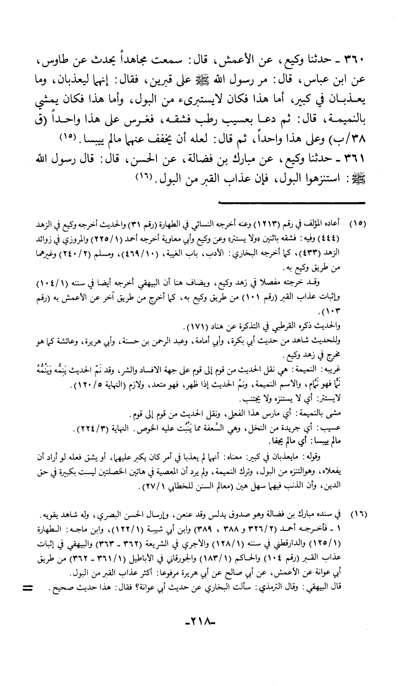 360 - حَدَّثَنَا وَكِيعٌ , عَنِ الْأَعْمَشِ قَالَ: سَمِعْتُ مُجَاهِدًا , يُحَدِّثُ عَنْ طَاوُسٍ , عَنِ ابْنِ عَبَّاسٍ قَالَ: مَرَّ رَسُولُ اللَّهِ صَلَّى اللهُ عَلَيْهِ وَسَلَّمَ عَلَى قَبْرَيْنِ , فَقَالَ: " §إِنَّهُمَا لَيُعَذَّبَانِ وَمَا يُعَذَّبَانِ فِي كَبِيرٍ: أَمَّا هَذَا فَكَانَ لَا يَسْتَبْرِئُ مِنَ الْبَوْلِ , وَأَمَّا هَذَا فَكَانَ يَمْشِي بِالنَّمِيمَةِ " قَالَ: ثُمَّ دَعَا بِعَسِيبٍ رَطْبٍ فَشَقَّهُ فَغَرَسَ عَلَى هَذَا وَاحِدًا وَعَلَى هَذَا وَاحِدًا , ثُمَّ قَالَ: «لَعَلَّهُ أَنْ يُخَفَّفَ عَنْهُمَا مَا لَمْ يَيْبَسَا»