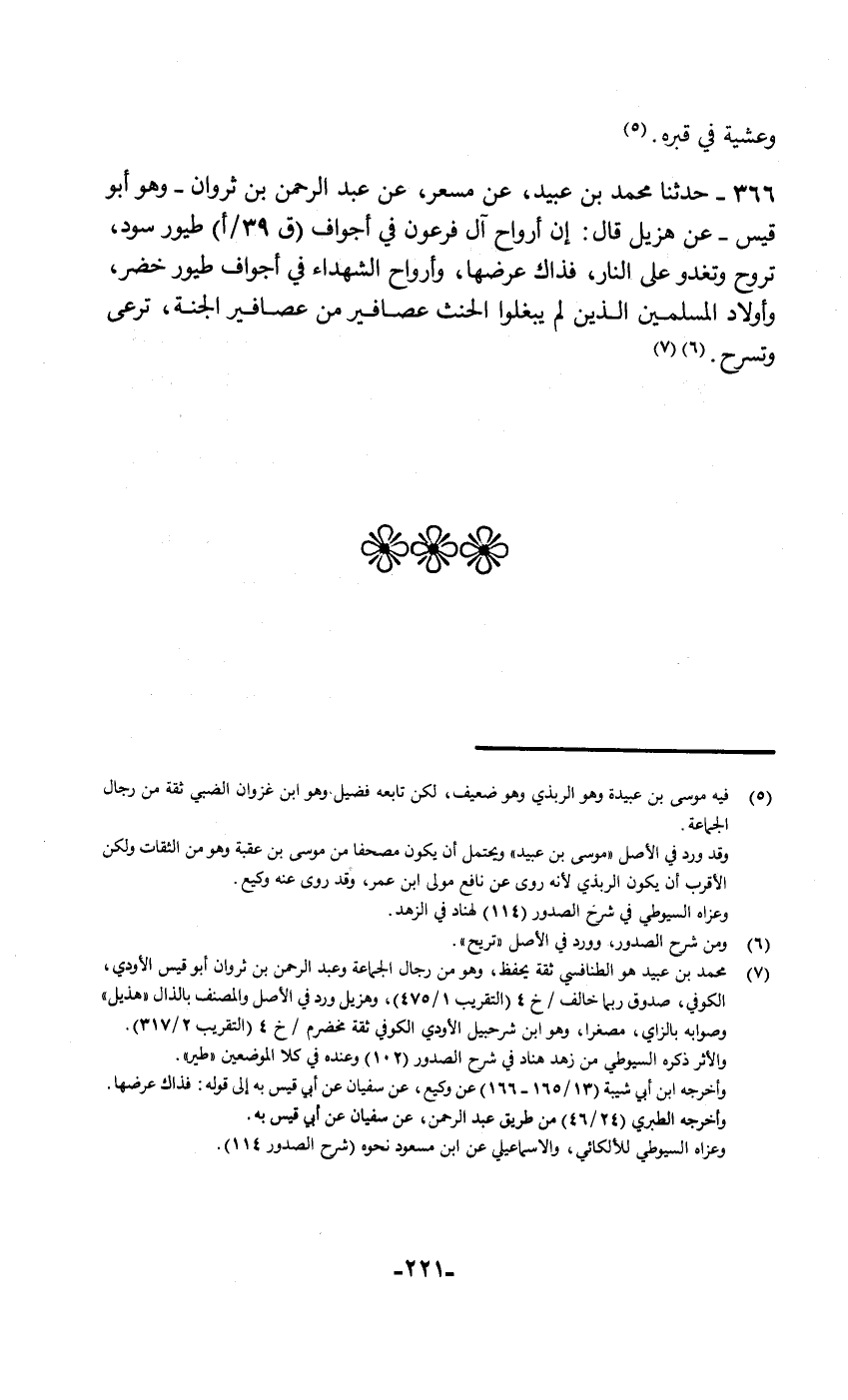 366 - حَدَّثَنَا مُحَمَّدُ بْنُ عُبَيْدٍ , عَنْ مِسْعَرٍ , عَنْ عَبْدِ الرَّحْمَنِ بْنِ ثَرْوَانَ وَهُوَ أَبُو قَيْسٍ , عَنْ هُزَيْلٍ قَالَ: «إِنَّ §أَرْوَاحَ آلِ فِرْعَوْنَ فِي أَجْوَافِ طُيُورٍ سُودٍ تَرُوحُ وَتَغْدُو عَلَى النَّارِ فَذَاكَ عَرْضُهَا , وَأَرْوَاحُ الشُّهَدَاءِ فِي أَجْوَافِ طُيُورٍ خُضْرٍ وَأَوْلَادُ الْمُسْلِمِينَ الَّذِينَ لَمْ يَبْلُغُوا الْحِنْثَ عَصَافِيرُ مِنْ عَصَافِيرِ الْجَنَّةِ تَرْعَى وَتَسْرَحُ»