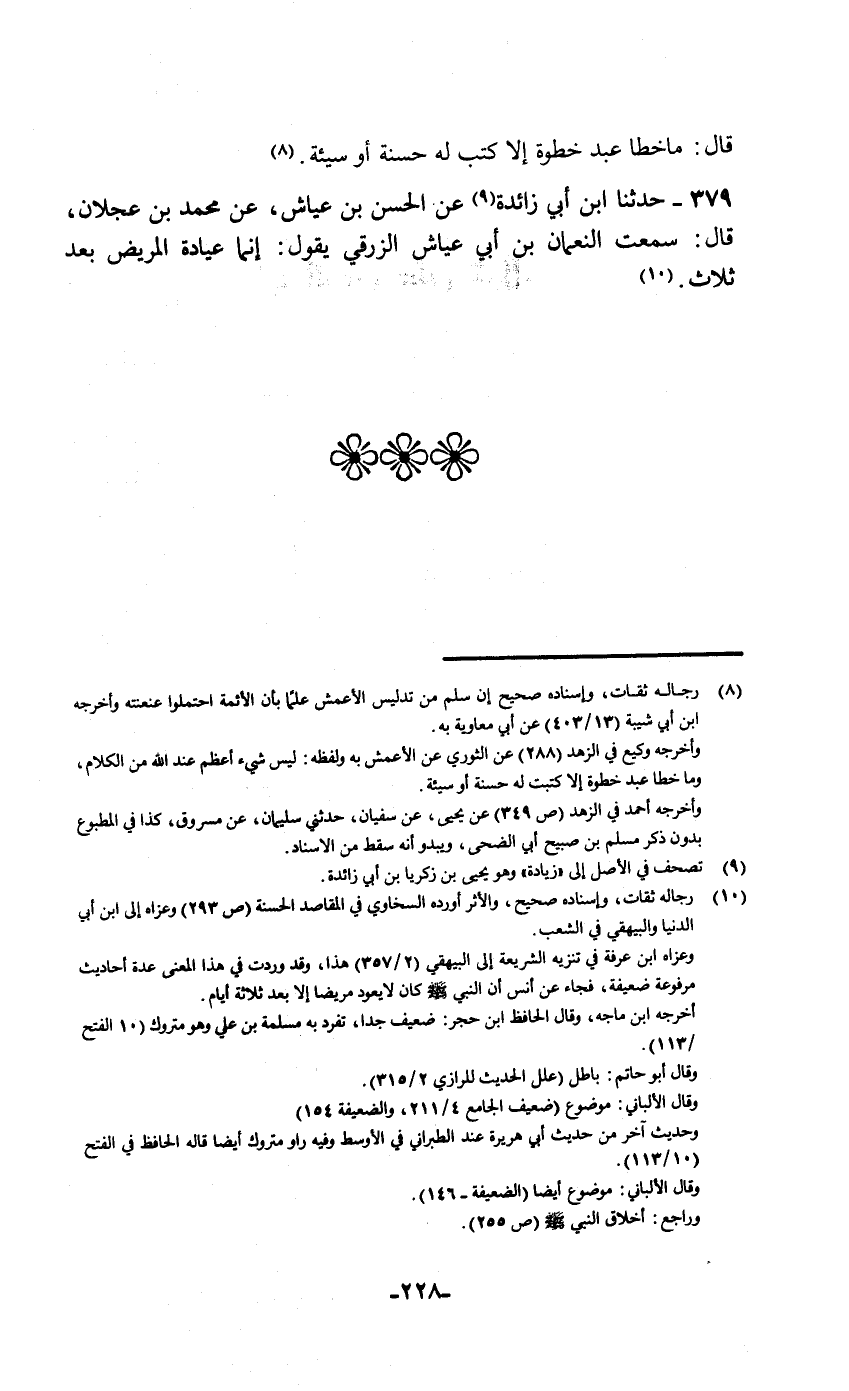 379 - حَدَّثَنَا ابْنُ أَبِي زَائِدَةَ , عَنِ الْحَسَنِ بْنِ عَيَّاشٍ , عَنْ مُحَمَّدِ بْنِ عَجْلَانَ قَالَ: سَمِعْتُ النُّعْمَانَ بْنَ أَبِي عَيَّاشٍ الزُّرَقِيَّ يَقُولُ: إِنَّمَا §عِيَادَةُ الْمَرِيضِ بَعْدَ ثَلَاثٍ "