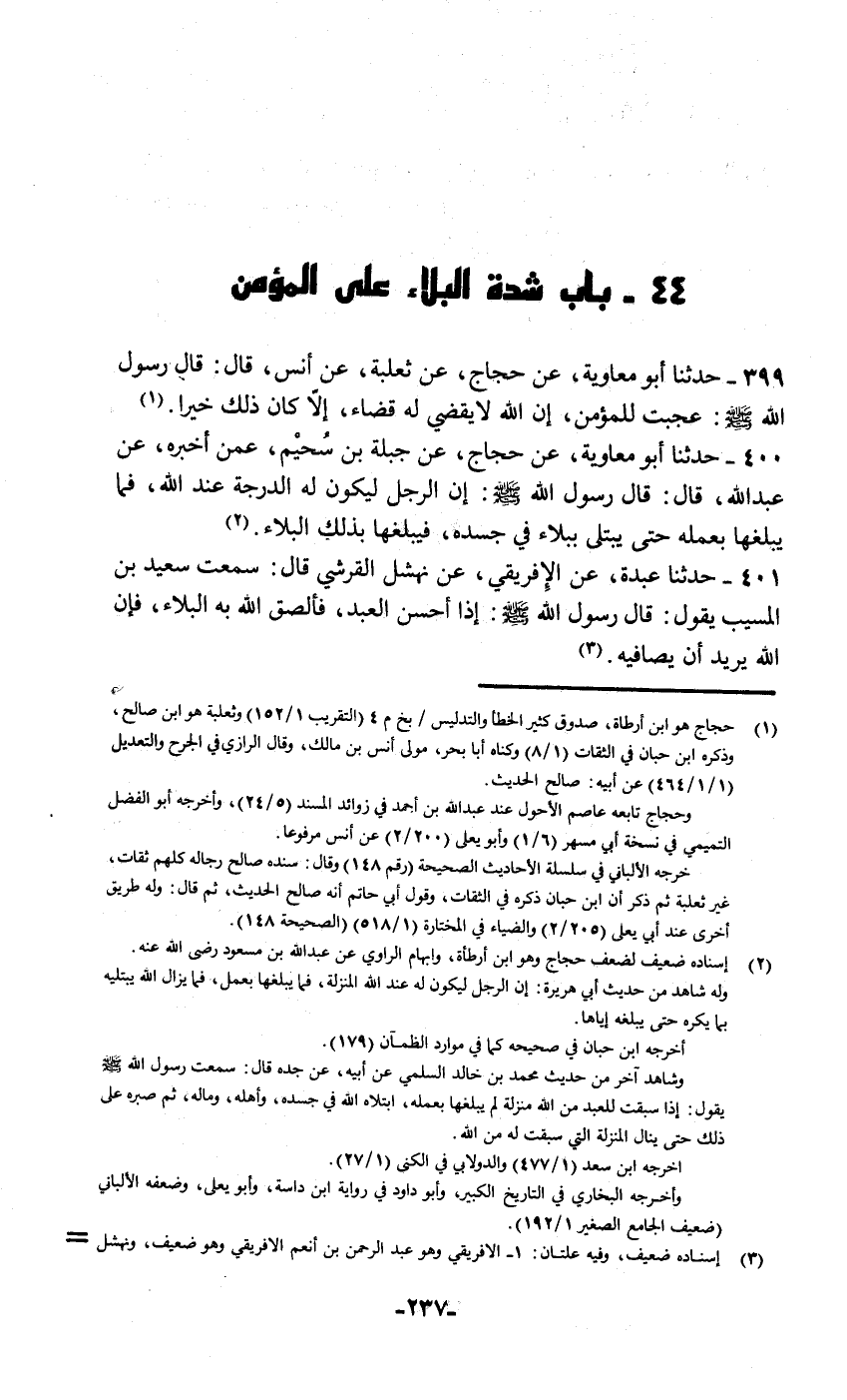 399 - حَدَّثَنَا أَبُو مُعَاوِيَةَ , عَنْ حَجَّاجٍ , عَنْ ثَعْلَبَةَ , عَنْ أَنَسٍ قَالَ: قَالَ رَسُولُ اللَّهِ صَلَّى اللهُ عَلَيْهِ وَسَلَّمَ: «§عَجِبْتُ لِلْمُؤْمِنِ، إِنَّ اللَّهَ لَا يَقْضِي لَهُ قَضَاءً إِلَّا كَانَ ذَلِكَ خَيْرًا»