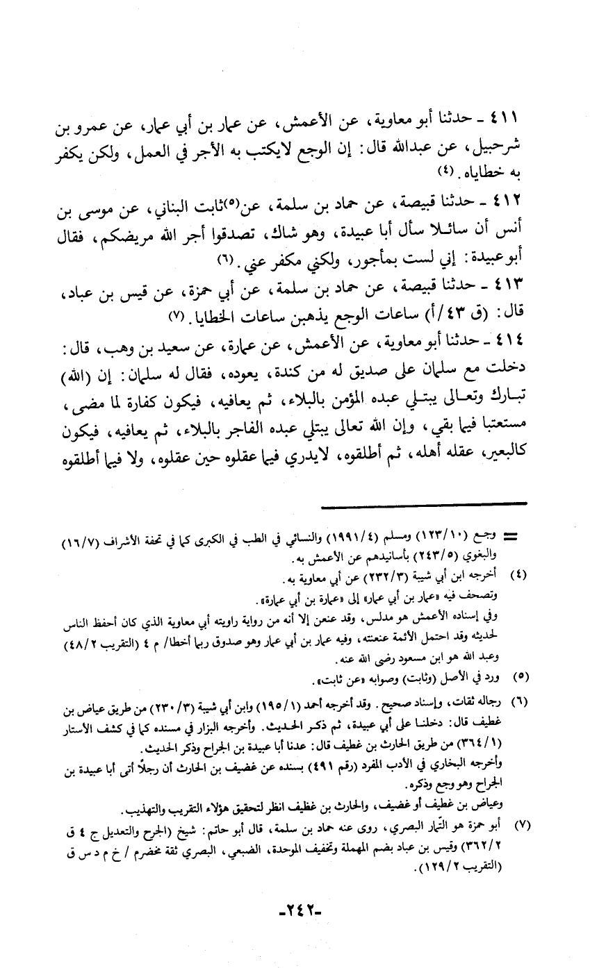 411 - حَدَّثَنَا أَبُو مُعَاوِيَةَ , عَنِ الْأَعْمَشِ , عَنْ عِمَارَةَ، عَنْ أَبِي عَمَّارٍ , عَنْ عَمْرِو بْنِ شُرَحْبِيلَ , عَنْ عَبْدِ اللَّهِ قَالَ: إِنَّ §الْوَجَعَ لَا يُكْتَبُ بِهِ الْأَجْرُ فِي الْعَمَلِ وَلَكِنْ يُكَفَّرُ بِهِ خَطَايَاهُ "