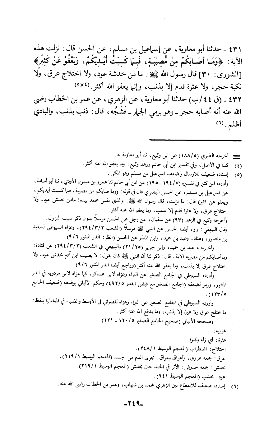 431 - حَدَّثَنَا أَبُو مُعَاوِيَةَ , عَنْ إِسْمَاعِيلَ بْنِ مُسْلِمٍ , عَنِ الْحَسَنِ قَالَ: نَزَلَتْ هَذِهِ الْآيَةُ {§وَمَا أَصَابَكُمْ مِنْ مُصِيبَةٍ فَبِمَا كَسَبَتْ أَيْدِيكُمْ وَيَعْفُو عَنْ كَثِيرٍ} [الشورى: 30] قَالَ رَسُولُ اللَّهِ صَلَّى اللهُ عَلَيْهِ وَسَلَّمَ: «مَا مِنْ خَدْشَةِ عُودٍ , وَلَا اخْتِلَاجِ عِرْقٍ , وَلَا نَكْبَةِ حَجَرٍ , وَلَا عَثْرَةِ قَدَمٍ إِلَّا بِذَنْبٍ , وَإِنَّمَا يَعْفُو اللَّهُ أَكْثَرُ»