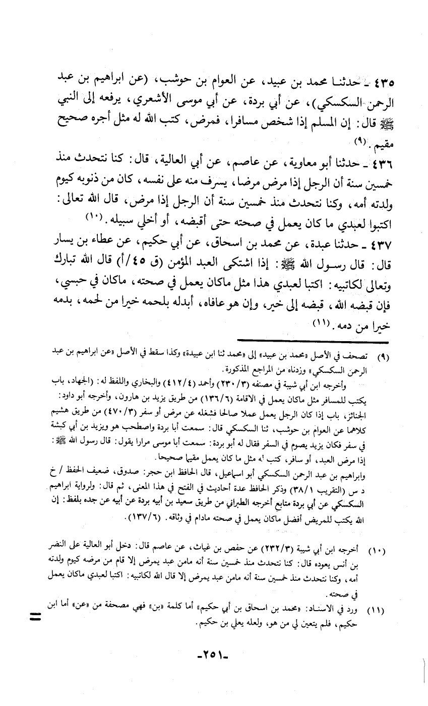 435 - حَدَّثَنَا مُحَمَّدُ بْنُ عُبَيْدٍ , عَنِ الْعَوَّامِ بْنِ حَوْشَبٍ , عَنْ إِبْرَاهِيمَ بْنِ عَبْدِ الرَّحْمَنِ السَّكْسَكِيِّ , عَنْ أَبِي بُرْدَةَ , عَنْ أَبِي مُوسَى الْأَشْعَرِيِّ , يَرْفَعُهُ إِلَى النَّبِيِّ صَلَّى اللهُ عَلَيْهِ وَسَلَّمَ قَالَ: «إِنَّ §الْمُسْلِمَ إِذَا شَخَصَ مُسَافِرًا , فَمَرِضَ كَتَبَ اللَّهُ لَهُ مِثْلَ أَجْرِهِ صَحِيحٌ مُقِيمٌ»