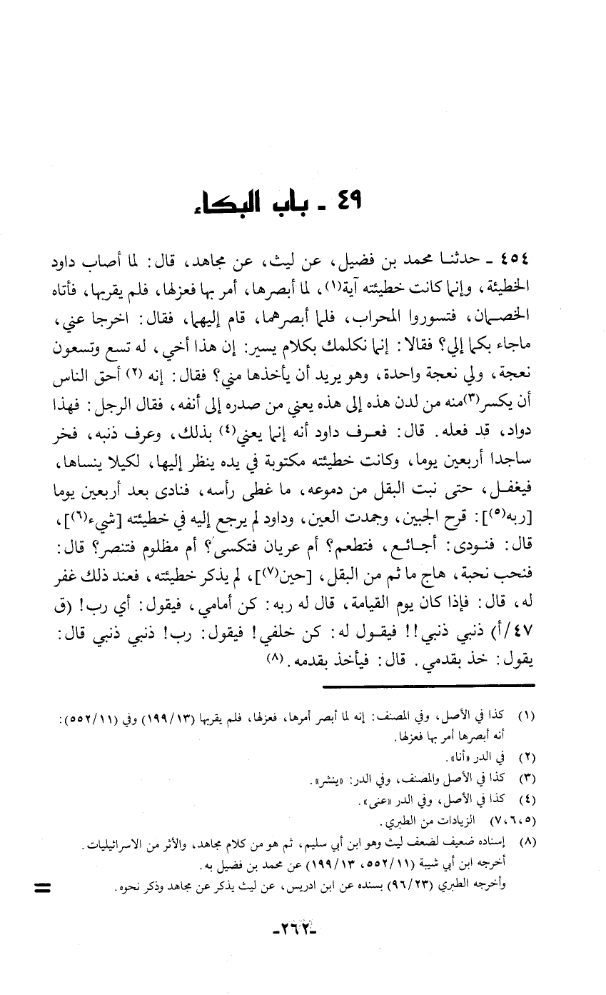 454 - حَدَّثَنَا مُحَمَّدُ بْنُ فُضَيْلٍ , عَنْ لَيْثٍ , عَنْ مُجَاهِدٍ قَالَ: §لَمَّا أَصَابَ دَاوُدُ الْخَطِيئَةَ , وَإِنَّمَا كَانَتْ خَطِيئَتُهُ آيَةً لَمَّا أَبْصَرَهَا أُمِرَ بِهَا , فَعَزَلَهَا , فَلَمْ يَقْرَبْهَا , فَأَتَاهُ الْخَصْمَانِ فَتَسَوَّرَا الْمِحْرَابِ , فَلَمَّا أَبْصَرَهُمَا قَامَ إِلَيْهِمَا , فَقَالَ: اخْرُجَا عَنِّي , مَا جَاءَ بِكُمَا إِلَيَّ؟ فَقَالَا: إِنَّمَا نُكَلِّمُكَ بِكَلَامٍ يَسِيرٍ , {إِنَّ هَذَا أَخِي لَهُ تِسْعٌ وَتِسْعُونَ نَعْجَةً وَلِيَ نَعْجَةٌ وَاحِدَةٌ} [ص: 23] وَهُوَ يُرِيدُ أَنْ يَأْخُذَهَا مِنِّي , فَقَالَ: إِنَّهُ أَحَقُّ النَّاسِ أَنْ يُكْسَرَ مِنْهُ مِنْ لَدُنْ هَذِهِ إِلَى هَذِهِ يَعْنِي مِنْ صَدْرِهِ إِلَى أَنْفِهِ , فَقَالَ الرَّجُلُ: فَهَذَا دَاوُدُ قَدْ فَعَلَهُ قَالَ: فَعَرَفَ دَاوُدُ أَنَّهُ إِنَّمَا يُعْنَى بِذَلِكَ , وَعَرَفَ ذَنْبَهُ فَخَرَّ سَاجِدًا أَرْبَعِينَ يَوْمًا، وَكَانَتْ خَطِيئَتُهُ مَكْتُوبَةً فِي يَدِهِ يَنْظُرُ إِلَيْهَا لِكَيْلَا يَنْسَاهَا فَيَغْفَلَ، حَتَّى نَبَتَ الْبَقْلُ مِنْ دُمُوعِهِ مَا غَطَّى رَأْسَهُ، فَنَادَى بَعْدَ أَرْبَعِينَ يَوْمًا رَبَّهُ: قَرِحَ الْجَبِينُ، وَجَمَدَتِ الْعَيْنُ، وَدَاوُدُ لَمْ يَرْجِعْ إِلَيْهِ فِي خَطِيئَتِهِ شَيْءٌ، قَالَ: فَنُودِيَ: أَجَائِعٌ فَتُطْعَمَ , أَمْ عُرْيَانٌ فَتُكْسَى , أَمْ مَظْلُومٌ فَتُنْصَرَ. قَالَ: فَنُحِبَ نَحْبَةً , هَاجَ مَا ثَمَّ مِنَ الْبَقْلِ حِينَ لَمْ يَذْكُرْ خَطِيئَتَهُ، فَعِنْدَ ذَلِكَ غُفِرَ لَهُ. قَالَ: فَإِذَا كَانَ يَوْمُ الْقِيَامَةِ قَالَ لَهُ رَبُّهُ: كُنْ أَمَامِي , فَيَقُولُ: أَيْ رَبِّ , ذَنْبِي ذَنْبِي , فَيَقُولُ: لَهُ: كُنْ خَلْفِي , فَيَقُولُ: رَبِّ , ذَنْبِي ذَنْبِي قَالَ: يَقُولُ خُذْ بِقَدَمِي قَالَ: فَيَأْخُذُ بِقَدَمِهِ "