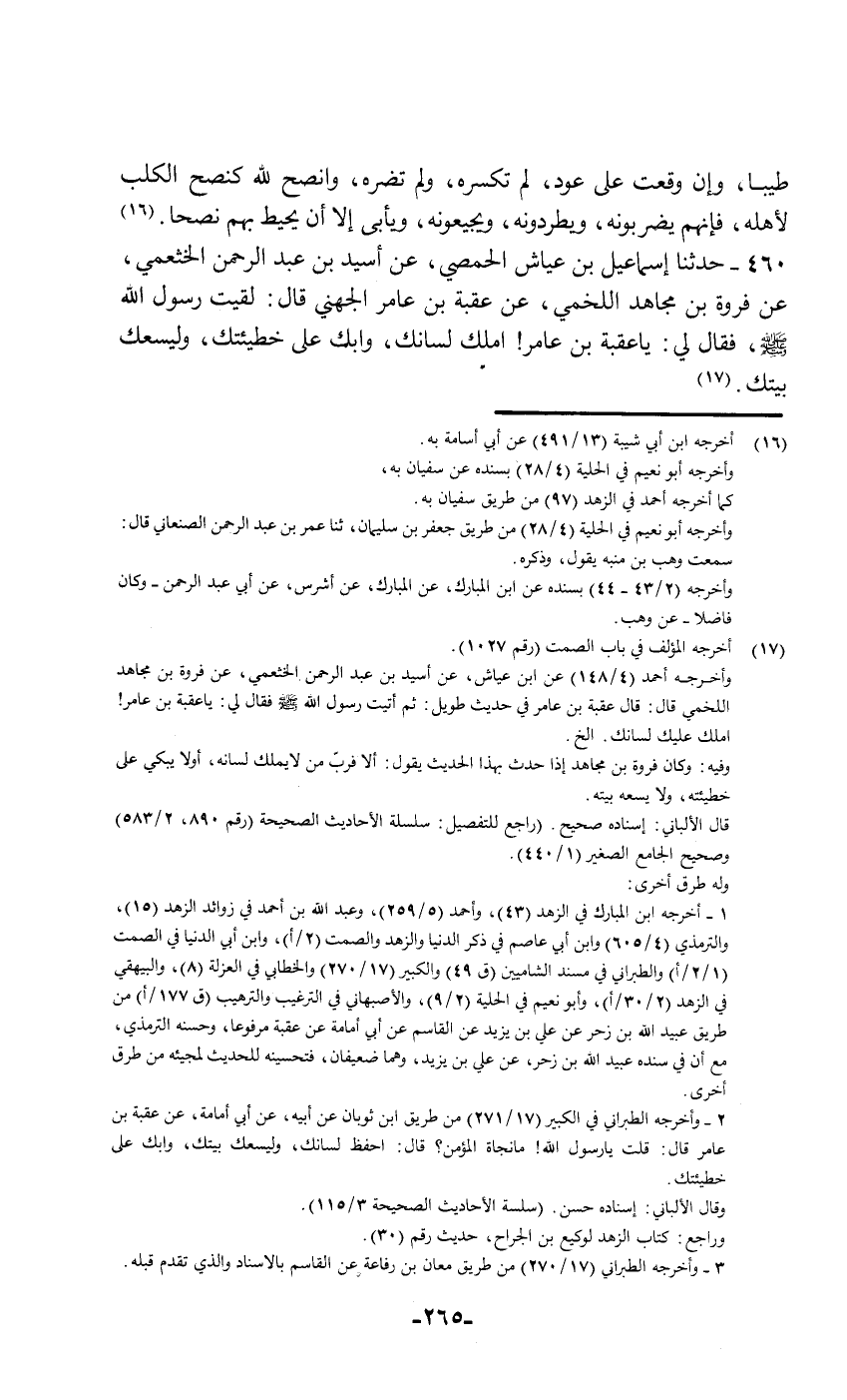 460 - حَدَّثَنَا إِسْمَاعِيلُ بْنُ عَيَّاشٍ الْحِمْصِيُّ , عَنْ أُسَيْدِ بْنِ عَبْدِ الرَّحْمَنِ الْخَثْعَمِيِّ , عَنْ فَرْوَةَ بْنِ مُجَاهِدٍ اللَّخْمِيِّ , عَنْ عُقْبَةَ بْنِ عَامِرٍ الْجُهَنِيِّ قَالَ: لَقِيتُ رَسُولَ اللَّهِ صَلَّى اللهُ عَلَيْهِ وَسَلَّمَ , فَقَالَ لِي: «يَا عُقْبَةُ بْنَ عَامِرٍ §أَمْلِكْ لِسَانَكَ وَابْكِ عَلَى خَطِيئَتِكَ وَلْيَسَعْكَ بَيْتُكَ»