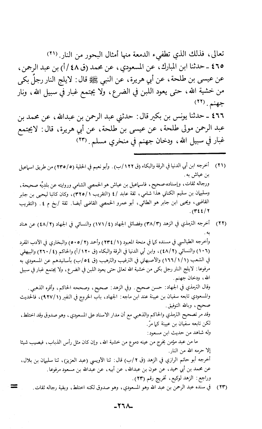 465 - حَدَّثَنَا ابْنُ الْمُبَارَكِ , عَنِ الْمَسْعُودِيِّ , عَنْ مُحَمَّدِ بْنِ عَبْدِ الرَّحْمَنِ , عَنْ عِيسَى بْنِ طَلْحَةَ , عَنْ أَبِي هُرَيْرَةَ , عَنِ النَّبِيِّ صَلَّى اللهُ عَلَيْهِ وَسَلَّمَ قَالَ: «§لَا يَلِجُ النَّارَ رَجُلٌ بَكَى مِنْ خَشْيَةِ اللَّهِ حَتَّى يَعُودَ اللَّبَنُ فِي الضَّرْعِ , وَلَا يَجْتَمِعُ غُبَارٌ فِي سَبِيلِ اللَّهِ وَنَارُ جَهَنَّمَ»