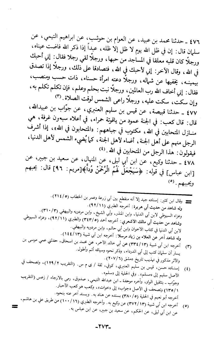476 - حَدَّثَنَا مُحَمَّدُ بْنُ عُبَيْدٍ , عَنِ الْعَوَّامِ بْنِ حَوْشَبٍ , عَنْ إِبْرَاهِيمَ التَّيْمِيِّ , عَنْ سَلْمَانَ قَالَ: " إِنَّ §فِي ظِلِّ اللَّهِ يَوْمَ لَا ظِلَّ إِلَّا ظِلُّهُ عَبْدًا إِذَا ذَكَرَ اللَّهَ فَاضَتْ عَيْنَاهُ , وَرَجُلًا كَانَ قَلْبُهُ مُعَلَّقًا فِي الْمَسَاجِدِ مِنْ حُبِّهَا , وَرَجُلًا لَقِيَ رَجُلًا , فَقَالَ: إِنِّي أُحِبُّكَ فِي اللَّهِ , وَقَالَ الْآخَرُ: إِنِّي لَأُحِبُّكَ فِي اللَّهِ فَتَصَادَقَا عَلَى ذَلِكَ , وَرَجُلًا إِذَا تَصَدَّقَ بِيَمِينِهِ يُخْفِيهَا عَنْ شِمَالِهِ , وَرَجُلًا دَعَتْهُ امْرَأَةٌ حَسْنَاءُ ذَاتُ حَسَبٍ وَمَنْصِبٍ , فَقَالَ: إِنِّي أَخَافُ اللَّهَ رَبَّ الْعَالَمِينَ , وَرَجُلًا نَبَتَ بِحِلْمٍ وَعِلْمٍ فَإِنْ تَكَلَّمَ تَكَلَّمَ بِهِ وَإِنْ سَكَتَ سَكَتَ عَلَيْهِ , وَرَجُلًا رَاعَى الشَّمْسَ لِوَقْتِ الصَّلَاةِ "