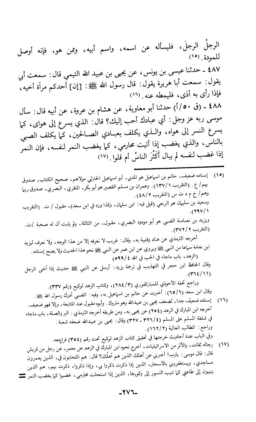 حَدَّثَنَا أَبُو مُعَاوِيَةَ , عَنْ هِشَامِ بْنِ عُرْوَةَ , عَنْ أَبِيهِ قَالَ: سَأَلَ مُوسَى رَبَّهُ عَزَّ وَجَلَّ: §أَيُّ عِبَادِكَ أَحَبُّ إِلَيْكَ؟ قَالَ: «الَّذِي يُسْرِعُ إِلَى هَوَايَ كَمَا يُسْرِعُ النَّسْرُ إِلَى هَوَاهُ , وَالَّذِي يَكْلَفُ بِعِبَادِي الصَّالِحِينَ كَمَا يَكْلَفُ الصَّبِيُّ بِالنَّاسِ , وَالَّذِي يَغْضَبُ إِذَا أُتِيَتْ مَحَارِمِي كَمَا يَغْضَبُ النَّمِرُ لِنَفْسِهِ , فَإِنَّ النَّمِرَ إِذَا غَضِبَ لِنَفْسِهِ لَمْ يُبَالِ أَكَثُرَ النَّاسُ أَمْ قَلُّوا»