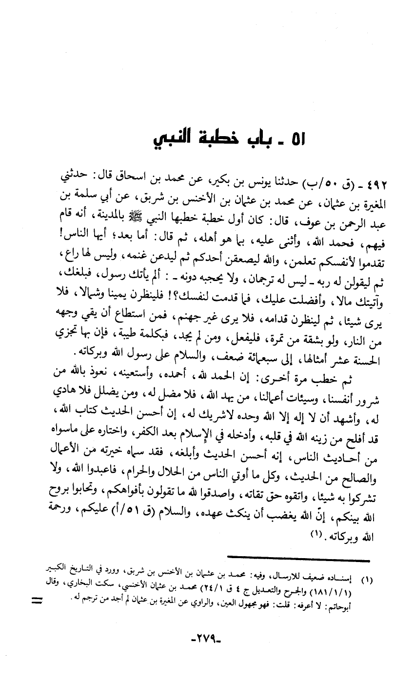 حَدَّثَنَا يُونُسُ بْنُ بُكَيْرٍ , عَنْ مُحَمَّدِ بْنِ إِسْحَاقَ قَالَ: حَدَّثَنِي الْمُغِيرَةُ بْنُ عُثْمَانَ , عَنْ مُحَمَّدِ بْنِ عُثْمَانَ بْنِ الْأَخْنَسِ بْنِ شَرْبَقٍ , عَنْ أَبِي سَلَمَةَ بْنِ عَبْدِ الرَّحْمَنِ بْنِ عَوْفٍ قَالَ: كَانَ أَوَّلُ خُطْبَةٍ خَطَبَهَا النَّبِيُّ صَلَّى اللهُ عَلَيْهِ وَسَلَّمَ بِالْمَدِينَةِ أَنَّهُ قَامَ فِيهِمْ , فَحَمِدَ اللَّهَ , وَأَثْنَى عَلَيْهِ بِمَا هُوَ أَهْلُهُ , ثُمَّ قَالَ: " أَمَّا بَعْدُ؛ أَيُّهَا النَّاسُ تَقَدَّمُوا لِأَنْفُسِكُمْ تَعْلَمُنَّ , وَاللَّهِ لَيُصْعَقَنَّ أَحَدُكُمْ , ثُمَّ لَيَدَعَنَّ غَنَمَهُ وَلَيْسَ لَهَا رَاعٍ , ثُمَّ لَيَقُولَنَّ لَهُ رَبُّهُ لَيْسَ لَهُ تُرْجُمَانٌ وَلَا يَحْجُبُهُ دُونَهُ: أَلَمْ يَأْتِكَ رَسُولٌ فَبَلَغَكَ؟ وَآتَيْتُكَ مَالًا وَأَفْضَلْتُ عَلَيْكَ؟ فَمَا قَدَّمْتَ لِنَفْسِكَ؟ فَلَيَنْظُرَنَّ يَمِينًا وَشِمَالًا فَلَا يَرَى شَيْئًا , ثُمَّ لَيَنْظُرَنَّ قُدَّامَهُ فَلَا يَرَى غَيْرَ جَهَنَّمَ , فَمَنِ اسْتَطَاعَ أَنْ §يَقِيَ وَجْهَهُ مِنَ النَّارِ وَلَوْ بِشِقَّةٍ مِنْ تَمْرَةٍ فَلْيَفْعَلْ , وَمَنْ لَمْ يَجِدْ فَبِكَلِمَةٍ طَيْبَةٍ؛ فَإِنَّ بِهَا تُجْزَى الْحَسَنَةُ عَشْرَ أَمْثَالِهَا إِلَى سَبْعِمِائَةِ ضِعْفٍ , وَالسَّلَامُ عَلَى رَسُولِ اللَّهِ وَبَرَكَاتُهُ " ثُمَّ خَطَبَ مَرَّةً أُخْرَى: «إِنَّ الْحَمْدَ لِلَّهِ أَحْمَدُهُ وَأَسْتَعِينُهُ , نَعُوذُ بِاللَّهِ مِنْ شُرُورِ أَنْفُسِنَا وَسَيِّئَاتِ أَعْمَالِنَا , مَنْ يَهْدِ اللَّهُ فَلَا مُضِلَّ لَهُ , وَمَنْ يُضْلِلْ فَلَا هَادِيَ لَهُ , وَأَشْهَدُ أَنْ لَا إِلَهَ إِلَّا اللَّهُ وَحْدَهُ لَا شَرِيكَ لَهُ. إِنَّ أَحْسَنَ الْحَدِيثِ كِتَابُ اللَّهِ قَدْ أَفْلَحَ مَنْ زَيَّنَهُ اللَّهُ فِي قَلْبِهِ وَأَدْخَلَهُ فِي الْإِسْلَامِ بَعْدَ الْكُفْرِ وَاخْتَارَهُ عَلَى مَا سِوَاهُ مِنْ أَحَادِيثِ النَّاسِ , إِنَّهُ أَحْسَنُ الْحَدِيثِ وَأَبْلَغُهُ فَقَدْ سَمَّاهُ خِيرَتَهُ مِنَ الْأَعْمَالِ وَالصَّالِحَ مِنَ الْحَدِيثِ , وَكُلُّ مَا أُوتِيَ النَّاسَ مِنَ الْحَلَالِ وَالْحَرَامِ , فاعَبْدُوا اللَّهَ , وَلَا تُشْرِكُوا بِهِ شَيْئًا , وَاتَّقُوهُ حَقَّ تُقَاتِهِ , وَاصْدُقُوا لِلَّهِ مَا تَقُولُونَ بِأَفْوَاهِكُمْ , وَتَحَابُّوا بِرُوحِ اللَّهِ بَيْنَكُمْ , إِنَّ اللَّهَ يَغْضَبُ أَنْ يُنْكَثَ عَهْدُهُ , وَالسَّلَامُ عَلَيْكُمْ وَرَحْمَةُ اللَّهِ وَبَرَكَاتُهُ»