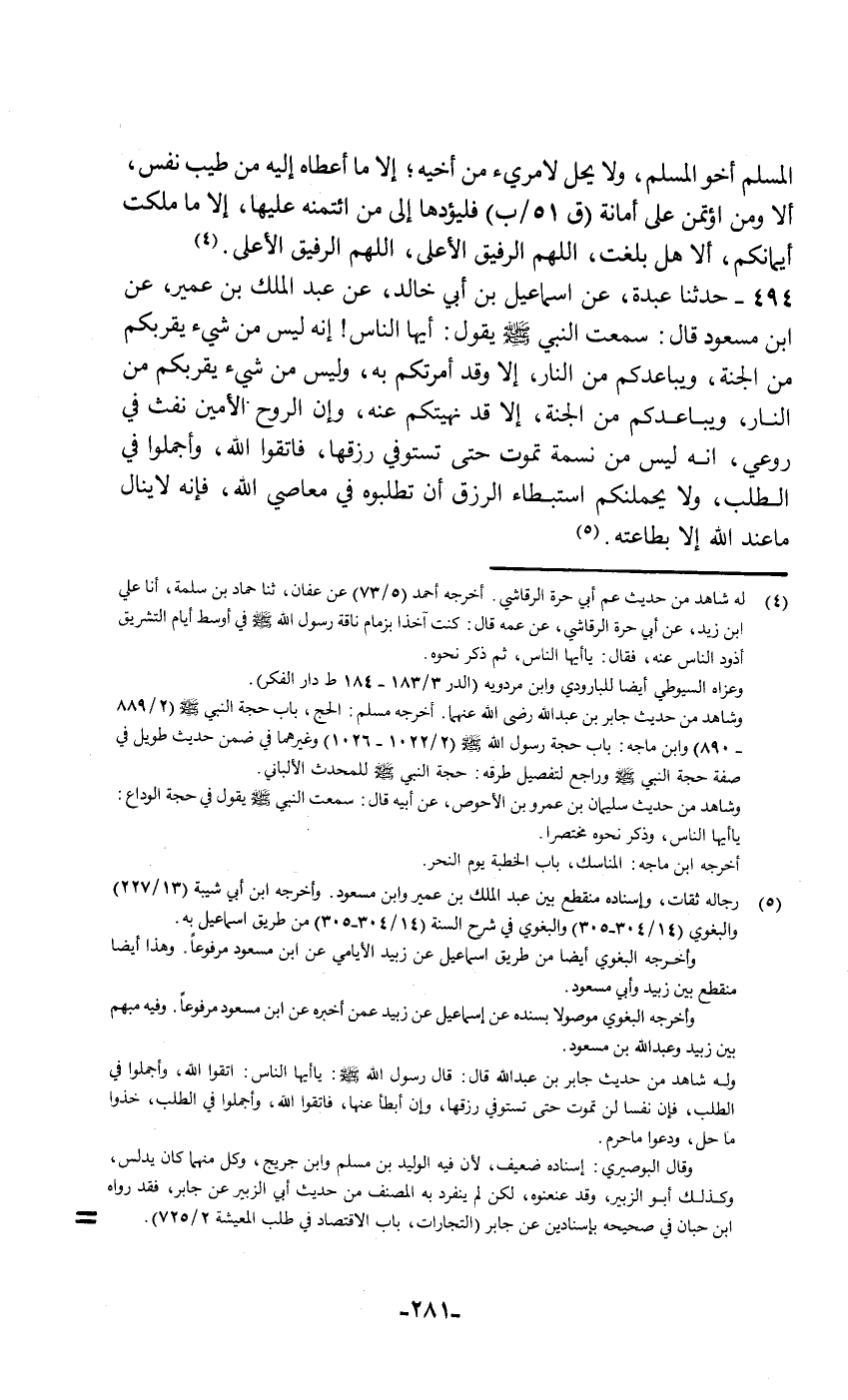 494 - حَدَّثَنَا عَبْدَةُ , عَنْ إِسْمَاعِيلَ بْنِ أَبِي خَالِدٍ , عَنْ عَبْدِ الْمَلِكِ بْنِ عُمَيْرٍ , عَنِ ابْنِ مَسْعُودٍ قَالَ: سَمِعْتُ النَّبِيَّ صَلَّى اللهُ عَلَيْهِ وَسَلَّمَ يَقُولُ: «أَيُّهَا النَّاسُ , إِنَّهُ لَيْسَ مِنْ شَيْءٍ يُقَرِّبُكُمْ مِنَ الْجَنَّةِ وَيُبَاعِدُكُمْ مِنَ النَّارِ إِلَّا وَقَدْ أَمَرْتُكُمْ بِهِ وَلَيْسَ مِنْ شَيْءٍ يُقَرِّبُكُمْ مِنَ النَّارِ وَيُبَاعِدُكُمْ مِنَ الْجَنَّةِ إِلَّا قَدْ نَهَيْتُكُمْ عَنْهُ , وَإِنَّ الرُّوحَ الْأَمِينَ نَفَثَ فِي رُوعِيَ أَنَّهُ لَيْسَ مِنْ نَسَمَةٍ تَمُوتُ §حَتَّى تَسْتَوْفِيَ رِزْقَهَا , فَاتَّقُوا اللَّهَ وَأَجْمِلُوا فِي الطَّلَبِ وَلَا يَحْمِلَنَّكُمُ اسْتِبْطَاءُ الرِّزْقِ أَنْ تَطْلُبُوهُ فِي مَعَاصِي اللَّهِ , فَإِنَّهُ لَا يُنَالُ مَا عِنْدَ اللَّهِ إِلَّا بِطَاعَتِهِ»