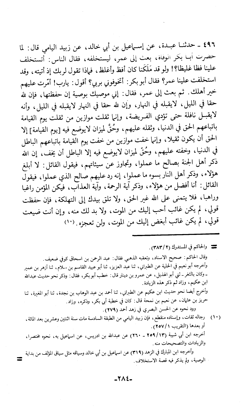496 - حَدَّثَنَا عَبْدَةُ , عَنْ إِسْمَاعِيلَ بْنِ أَبِي خَالِدٍ , عَنْ زُبَيْدٍ الْيَامِيِّ قَالَ: لَمَّا حَضَرَتْ أَبَا بَكْرِ الْوَفَاةُ بَعَثَ إِلَى عُمَرَ لِيَسْتَخْلِفَهُ , فَقَالَ النَّاسُ: أَتَسْتَخْلِفُ عَلَيْنَا فَظًّا غَلِيظًا وَلَوْ قَدْ مَلَكَنَا كَانَ أَفَظَّ وَأَغْلَظَ , فَمَاذَا تَقُولُ لِرَبِّكَ إِذْ أَتَيْتَهُ وَقَدِ اسْتَخْلَفْتَ عَلَيْنَا عُمَرَ؟ فَقَالَ أَبُو بَكْرٍ: " أَتُخَوِّفُونِي بِرَبِّي؟ أَقُولُ: يَا رَبِّ، §أَمَّرْتُ عَلَيْهِمْ خَيْرَ أَهْلِكَ , ثُمَّ بَعَثَ إِلَى عُمَرَ , فَقَالَ: " إِنِّي مُوصِيكَ بِوَصِيَّةٍ إِنْ حَفِظْتَهَا، فَإِنَّ لِلَّهِ حَقًّا فِي اللَّيْلِ لَا يَقْبَلُهُ فِي النَّهَارِ , وَإِنَّ لِلَّهِ حَقًّا فِي النَّهَارِ لَا يَقْبَلُهُ فِي اللَّيْلِ , وَإِنَّهُ لَا يَقْبَلُ نَافِلَةً حَتَّى تُؤَدَّى الْفَرِيضَةُ , وَإِنَّمَا ثَقُلَتْ مَوَازِينُ مَنْ ثَقُلَتْ يَوْمَ الْقِيَامَةِ بِاتِّبَاعِهِمُ الْحَقَّ فِي الدُّنْيَا , وَثُقْلُهُ عَلَيْهِمْ , وَحُقَّ لِمِيزَانٍ لَا يُوضَعُ فِيهِ يَوْمَ الْقِيَامَةِ إِلَّا الْحَقُّ أَنْ يَكُونَ ثَقِيلًا , وَإِنَّمَا خَفَّتْ مَوَازِينُ مَنْ خَفَّتْ يَوْمَ الْقِيَامَةِ بِاتِّبَاعِهِمُ الْبَاطِلَ فِي الدُّنْيَا , وَخِفَّتُهُ عَلَيْهِمْ , وَحُقَّ لِمِيزَانٍ لَا يُوضَعُ فِيهِ إِلَّا الْبَاطِلُ أَنْ يَخِفَّ , إِنَّ اللَّهَ ذَكَرَ أَهْلَ الْجَنَّةِ بِصَالِحِ مَا عَمِلُوا وَتَجَاوَزَ عَنْ سَيِّئَاتِهِمْ , فَيَقُولُ الْقَائِلُ: لَا أَبْلُغُ هَؤُلَاءِ , وَذَكَرَ أَهْلَ النَّارِ بِسُوءِ مَا عَمِلُوا؛ إِنَّهُ رَدَّ عَلَيْهِمْ صَالِحَ الَّذِي عَمِلُوا , فَيَقُولُ الْقَائِلُ: أَنَا أَفْضَلُ مِنْ هَؤُلَاءِ , وَذَكَرَ آيَةَ الرَّحْمَةِ وَآيَةَ الْعَذَابِ فَلْيَكُنِ الْمُؤْمِنُ رَاغِبًا وَرَاهِبًا فَلَا يَتَمَنَّى عَلَى اللَّهِ غَيْرَ الْحَقِّ , وَلَا تُلْقِ بِيَدِكَ إِلَى التَّهْلُكَةِ فَإِنْ حَفِظْتَ قَوْلِي لَمْ يَكُنْ غَائِبٌ أَحَبَّ إِلَيْكَ مِنَ الْمَوْتِ , وَلَا بُدَّ لَكَ مِنْهُ , وَإِنْ أَنْتَ ضَيَّعْتَ قَوْلِي لَمْ يَكُنْ غَائِبٌ أَبْغَضَ إِلَيْكَ مِنَ الْمَوْتِ وَلَنْ تُعْجِزَهُ "