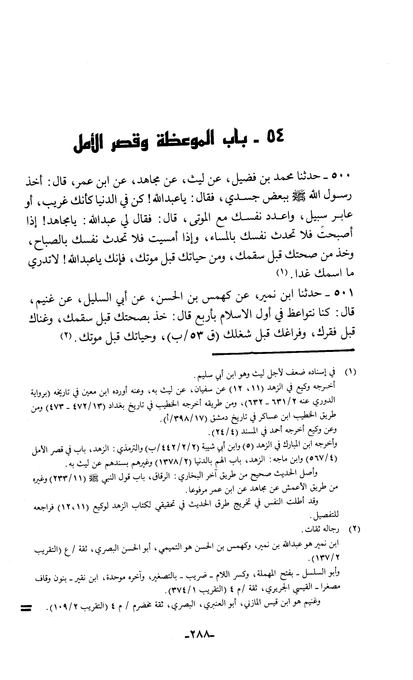 500 - حَدَّثَنَا مُحَمَّدُ بْنُ فُضَيْلٍ , عَنْ لَيْثٍ , عَنْ مُجَاهِدٍ , عَنِ ابْنِ عُمَرَ قَالَ: أَخَذَ رَسُولُ اللَّهِ صَلَّى اللهُ عَلَيْهِ وَسَلَّمَ بِبَعْضِ جَسَدِي , فَقَالَ: «يَا عَبْدَ اللَّهِ §كُنْ فِي الدُّنْيَا كَأَنَّكَ غَرِيبٌ أَوْ عَابِرُ سَبِيلٍ , وَاعْدُدْ نَفْسَكَ مَعَ الْمَوْتَى» . قَالَ: فَقَالَ لِي عَبْدُ اللَّهِ: يَا مُجَاهِدُ إِذَا أَصْبَحْتَ فَلَا تُحَدِّثْ نَفْسَكَ بِالْمَسَاءِ , وَإِذَا أَمْسَيْتَ فَلَا تُحَدِّثْ نَفْسَكَ بِالصَّبَاحِ , وَخُذْ مِنْ صِحَّتِكَ قَبْلَ سَقَمِكَ وَمِنْ حَيَاتِكَ قَبْلَ مَوْتِكَ فَإِنَّكَ يَا عَبْدَ اللَّهِ لَا تَدْرِي مَا اسْمُكَ غَدًا