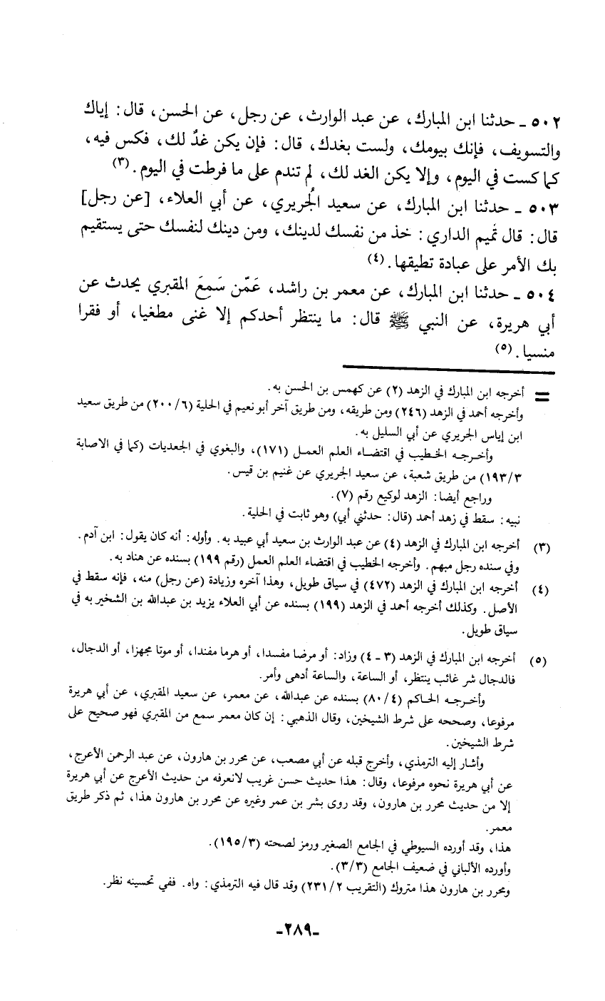 503 - حَدَّثَنَا ابْنُ الْمُبَارَكِ , عَنْ سَعِيدٍ الْجُرَيْرِيِّ , عَنْ أَبِي الْعَلَاءِ , عَنْ رَجُلٍ قَالَ: قَالَ تَمِيمٌ الدَّارِيُّ: «§خُذْ مِنْ نَفْسِكِ لِدِينِكَ , وَمِنْ دِينِكَ لِنَفْسِكَ حَتَّى يَسْتَقِيمَ بِكَ الْأَمْرُ عَلَى عِبَادَةٍ تُطِيقُهَا»