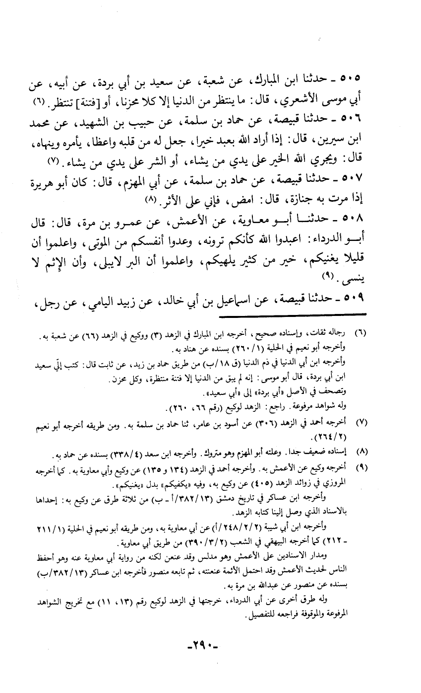 506 - حَدَّثَنَا قَبِيصَةُ , عَنْ حَمَّادِ بْنِ سَلَمَةَ , عَنْ حَبِيبِ بْنِ الشَّهِيدِ , عَنْ مُحَمَّدِ بْنِ سِيرِينَ قَالَ: " §إِذَا أَرَادَ اللَّهُ بِعَبْدٍ خَيْرًا جَعَلَ لَهُ مِنْ قَلْبِهِ وَاعِظًا يَأْمُرُهُ وَيَنْهَاهُ قَالَ: وَيُجْرِي اللَّهُ الْخَيْرَ عَلَى يَدَيْ مَنْ يَشَاءُ أَوِ الشَّرَّ عَلَى يَدَيْ مَنْ يَشَاءُ "