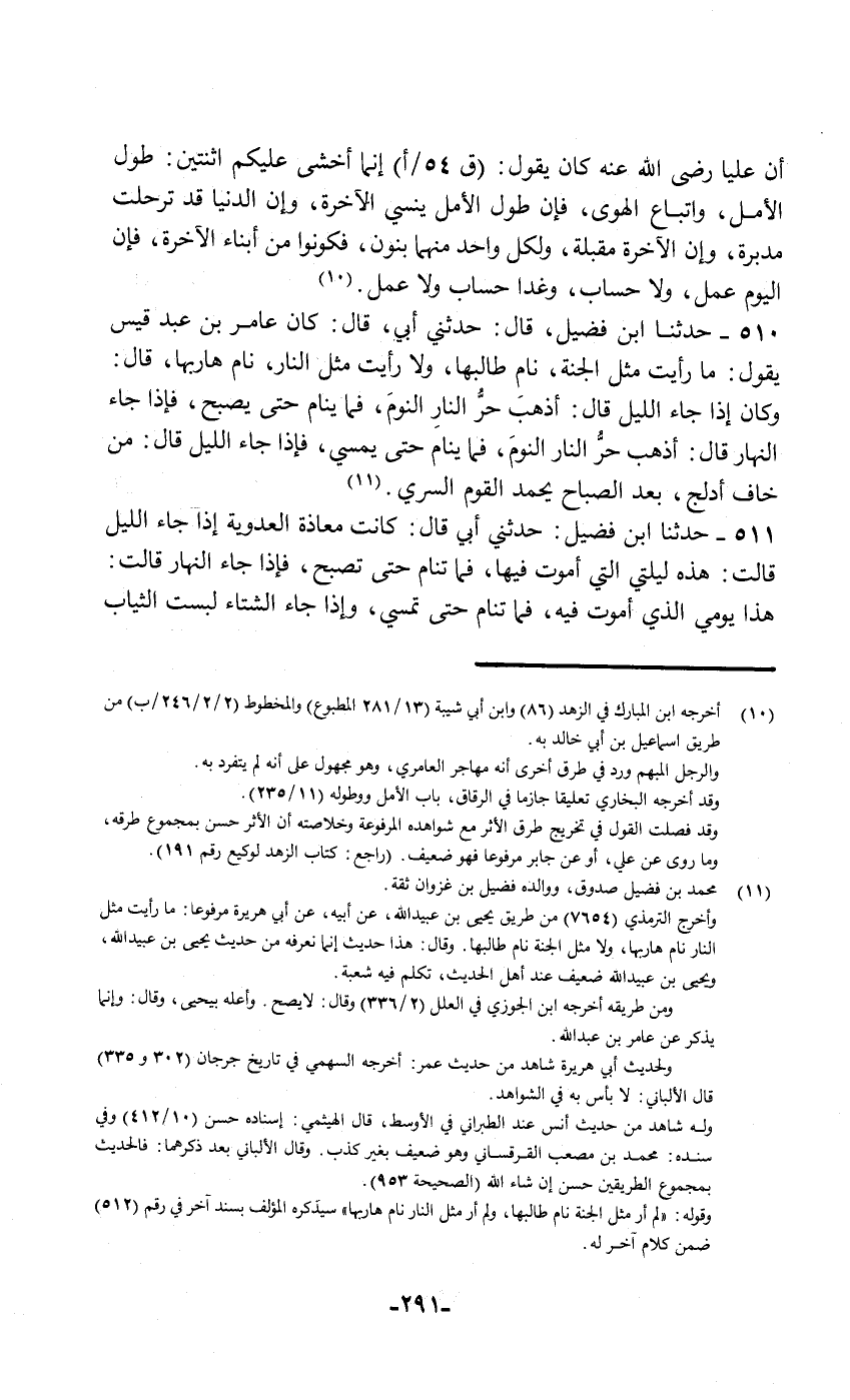 510 - حَدَّثَنَا ابْنُ فُضَيْلٍ قَالَ: حَدَّثَنِي أَبِي قَالَ: كَانَ عَامِرُ بْنُ عَبْدِ قَيْسٍ يَقُولُ: «§مَا رَأَيْتُ مِثْلَ الْجَنَّةِ نَامَ طَالِبُهَا , وَلَا رَأَيْتُ مِثْلَ النَّارَ نَامَ هَارِبُهَا» قَالَ: وَكَانَ إِذَا جَاءَ اللَّيْلُ قَالَ: «أَذْهَبَ حَرُّ النَّارِ النَّوْمَ» , فَمَا يَنَامُ حَتَّى يُصْبِحَ , فَإِذَا جَاءَ النَّهَارُ قَالَ: «أَذْهَبَ حُرُّ النَّارِ النَّوْمَ» فَمَا يَنَامُ حَتَّى يُمْسِيَ , فَإِذَا جَاءَ اللَّيْلُ قَالَ: «مَنْ خَافَ أَدْلَجَ بَعْدَ الصَّبَاحِ يَحْمَدُ الْقَوْمُ السُّرَى»