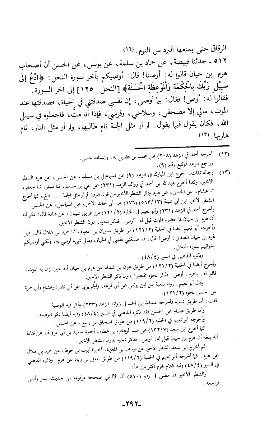512 - حَدَّثَنَا قَبِيصَةُ , عَنْ حَمَّادِ بْنِ سَلَمَةَ , عَنْ يُونُسَ , عَنِ الْحَسَنِ , أَنَّ أَصْحَابَ هَرِمِ بْنِ حَيَّانَ قَالُوا لَهُ: أَوْصِنَا قَالَ: " §أُوصِيكُمْ بِآخِرِ سُورَةِ النَّحْلِ {ادْعُ إِلَى سَبِيلِ رَبِّكَ بِالْحِكْمَةِ وَالْمَوْعِظَةِ الْحَسَنَةِ} [النحل: 125] " إِلَى آخِرِ السُّورَةِ , فَقَالُوا لَهُ: أَوْصِ , فَقَالَ: «بِمَا أَوْصِي إِنَّ نَفْسِي صَدَّقَتْنِي فِي الْحَيَاةِ فَصَدَّقْتُهَا عِنْدَ الْمَوْتِ مَالِي إِلَّا مُصْحَفِي وَسِلَاحِي وَفَرَسِي فَإِذَا أَنَا مُتُّ فَاجْعَلُوهُ فِي سَبِيلِ اللَّهِ» فَكَانَ يَقُولُ فِيمَا يَقُولُ: «لَمْ أَرَ مِثْلَ الْجَنَّةِ نَامَ طَالِبُهَا , وَلَمْ أَرَ مِثْلَ النَّارِ نَامَ هَارِبُهَا»