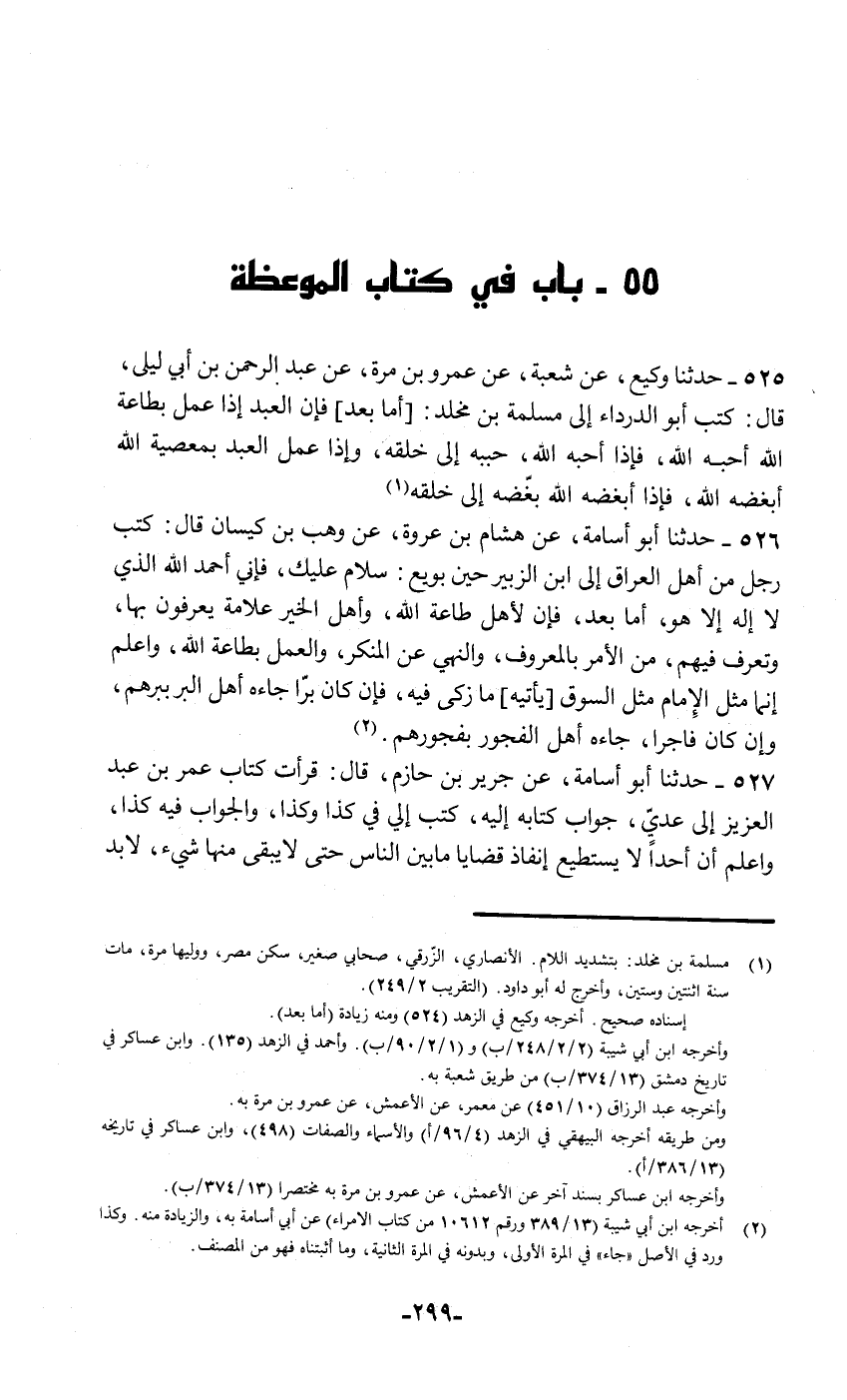 525 - حَدَّثَنَا وَكِيعٌ , عَنْ شُعْبَةَ , عَنْ عَمْرِو بْنِ مُرَّةَ , عَنْ عَبْدِ الرَّحْمَنِ بْنِ أَبِي لَيْلَى قَالَ: كَتَبَ أَبُو الدَّرْدَاءِ إِلَى مَسْلَمَةَ بْنِ مَخْلَدٍ: «أَمَّا بَعْدُ , فَإِنَّ §الْعَبْدَ إِذَا عَمِلَ بِطَاعَةِ اللَّهِ أَحَبَّهُ اللَّهُ , فَإِذَا أَحَبَّهُ اللَّهُ حَبَّبَهُ إِلَى خَلْقِهِ , وَإِذَا عَمِلَ الْعَبْدُ بِمَعْصِيَةِ اللَّهِ أَبْغَضَهُ اللَّهُ فَإِذَا أَبْغَضَهُ اللَّهُ بَغَّضَهُ إِلَى خَلْقِهِ»