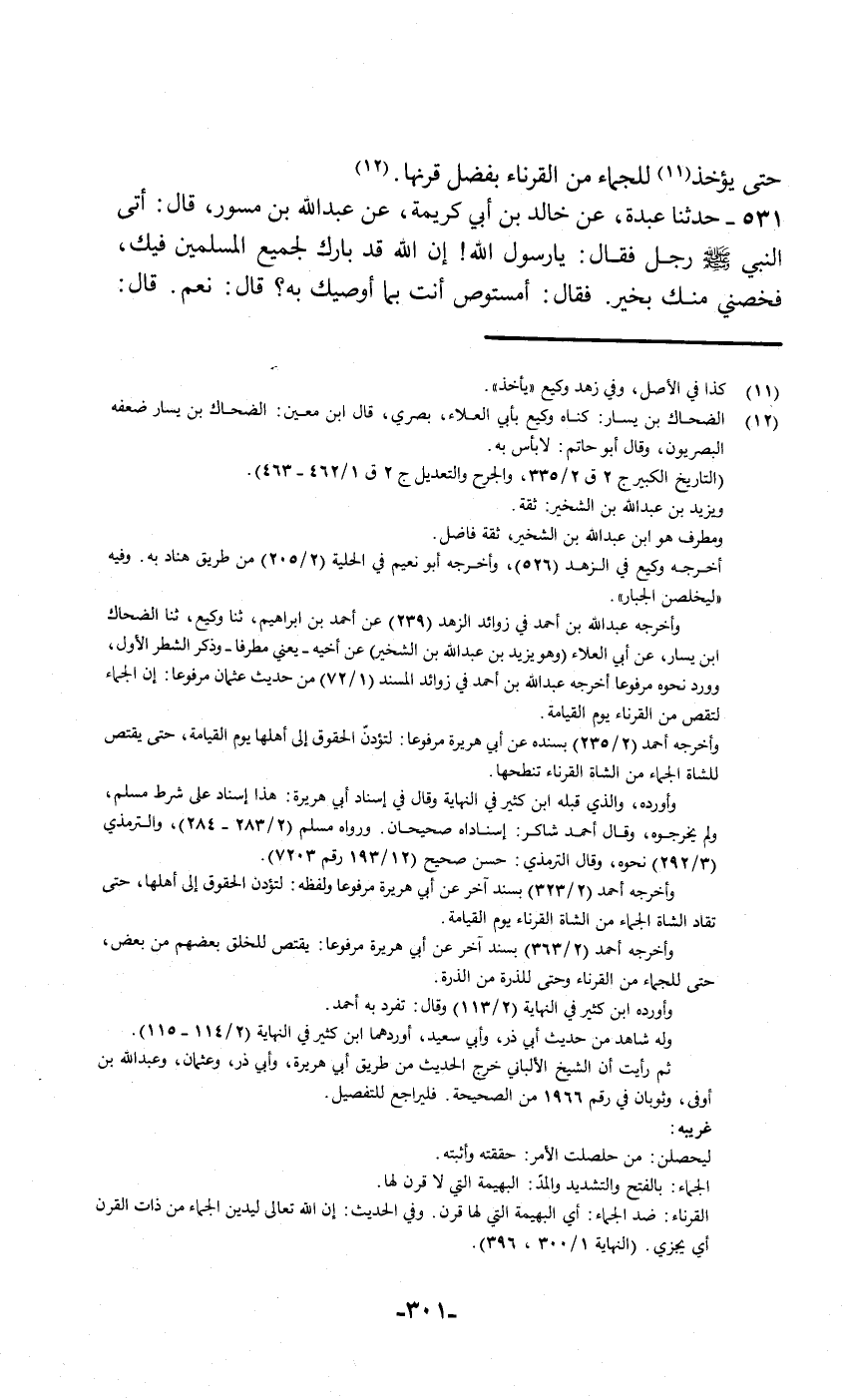 531 - حَدَّثَنَا عَبْدَةُ , عَنْ خَالِدِ بْنِ أَبِي كَرِيمَةَ , عَنْ عَبْدِ اللَّهِ بْنِ مِسْوَرٍ قَالَ: أَتَى النَّبِيَّ صَلَّى اللهُ عَلَيْهِ وَسَلَّمَ رَجُلٌ , فَقَالَ: يَا رَسُولَ اللَّهِ إِنَّ اللَّهَ قَدْ بَارَكَ لِجَمِيعِ الْمُسْلِمِينَ فِيكَ فَخُصَّنِي مِنْكَ بِخَيْرٍ , فَقَالَ: «أَمُسْتَوْصٍ أَنْتَ بِمَا أُوصِيكَ بِهِ» ؟ قَالَ: نَعَمْ. قَالَ -[302]-: «اجْلِسْ , §إِذَا هَمَمْتَ بِأَمْرٍ فَتَدَبَّرْ عَاقِبَتَهُ , وَإِنْ كَانَ رُشْدًا فَأَمْضِهِ , وَإِنْ كَانَ غَيًّا فَانْتَهِ عَنْهُ»