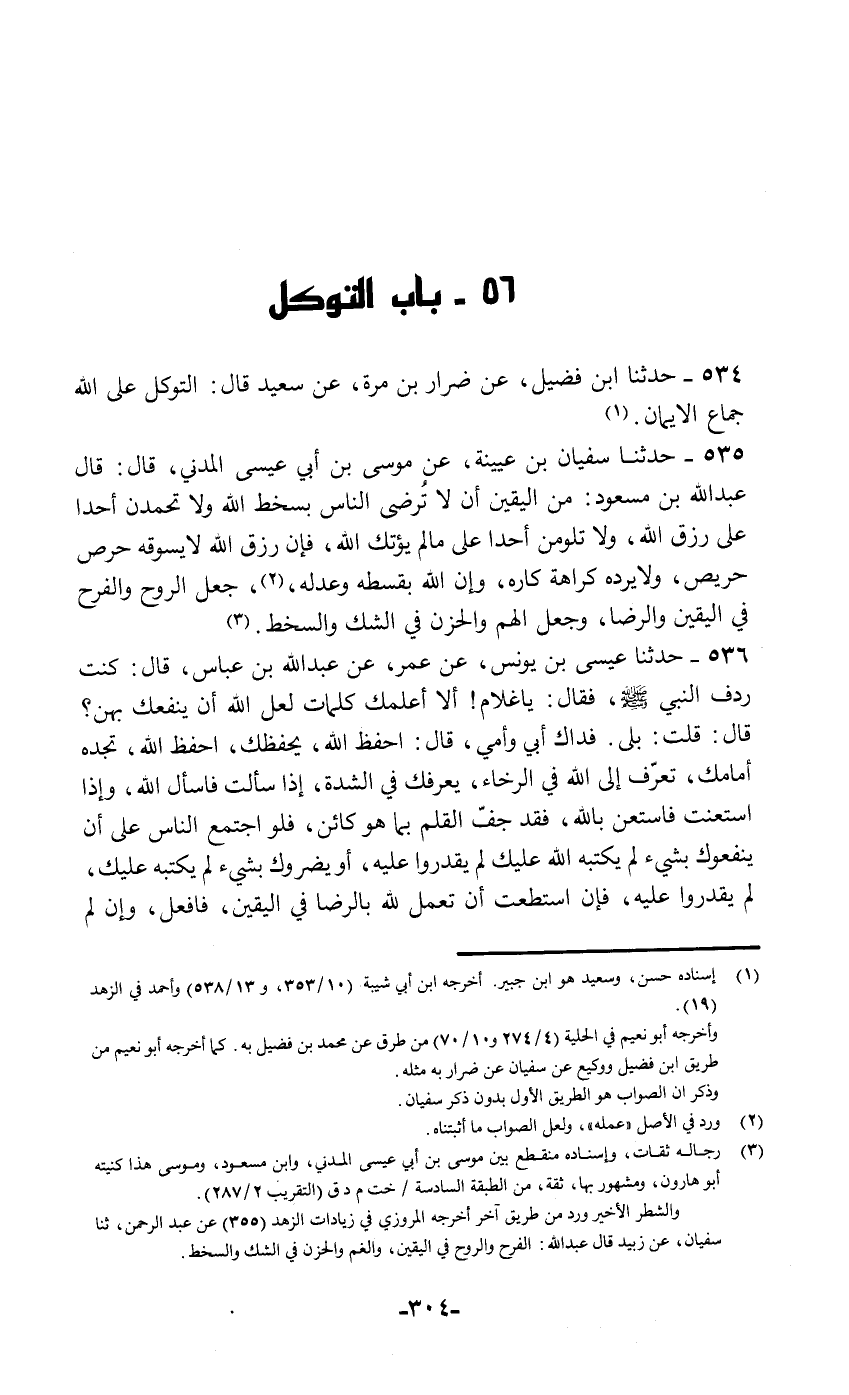 536 - حَدَّثَنَا عِيسَى بْنُ يُونُسَ , عَنْ عُمَرَ , عَنْ عَبْدِ اللَّهِ بْنِ عَبَّاسٍ قَالَ: كُنْتُ رِدْفَ النَّبِيِّ صَلَّى اللهُ عَلَيْهِ وَسَلَّمَ , فَقَالَ: «يَا غُلَامُ , أَلَا أُعَلِّمُكَ كَلِمَاتٍ لَعَلَّ اللَّهَ أَنْ يَنْفَعَكَ بِهِنَّ» ؟ قَالَ: قُلْتُ: بَلَى , فِدَاكَ أَبِي وَأُمِّي قَالَ: «§احْفَظِ اللَّهَ يَحْفَظْكَ. احْفَظِ اللَّهَ تَجِدْهُ أَمَامَكَ. تَعَرَّفْ إِلَى اللَّهِ فِي الرَّخَاءِ يَعْرِفْكَ فِي الشِّدَّةِ. إِذَا سَأَلْتَ فَاسْأَلِ اللَّهَ , وَإِذَا اسْتَعَنْتَ فَاسْتَعِنْ بِاللَّهِ؛ فَقَدْ جَفَّ الْقَلَمُ بِمَا هُوَ كَائِنٌ فَلَوِ اجْتَمَعَ النَّاسُ عَلَى أَنْ يَنْفَعُوكَ بِشَيْءٍ لَمْ يَكْتُبْهُ اللَّهُ عَلَيْكَ لَمْ يَقْدِرُوا عَلَيْهِ , أَوْ يَضُرُّوكَ بِشَيْءٍ لَمْ يَكْتُبْهُ عَلَيْكَ لَمْ يَقْدِرُوا عَلَيْهِ , فَإِنِ اسْتَطَعْتَ أَنْ تَعْمَلَ لِلَّهِ بِالرِّضَا فِي الْيَقِينِ فَافْعَلْ , وَإِنْ لَمْ -[305]- تَسْتَطِعْ فَإِنَّ فِي الصَّبْرِ عَلَى مَا تَكْرَهُ خَيْرًا , وَاعْلَمْ أَنَّ النَّصْرَ مَعَ الصَّبْرِ , وَأَنَّ الْفَرَجَ مَعَ الْكَرْبِ , وَأَنَّ مَعَ الْعُسْرِ يَسِّرَا»