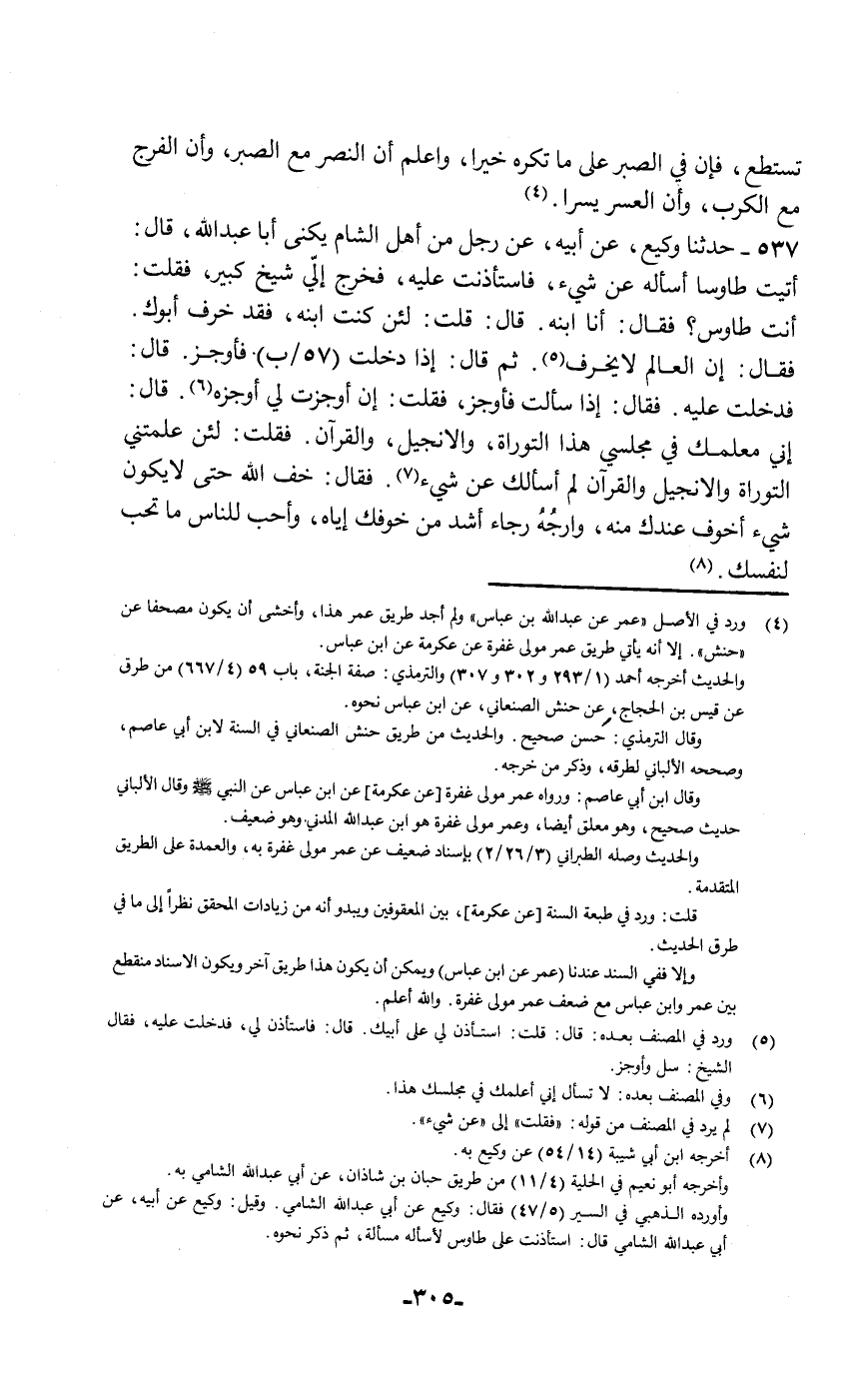 537 - حَدَّثَنَا وَكِيعٌ , عَنْ أَبِيهِ , عَنْ رَجُلٍ , مِنْ أَهْلِ الشَّامِ يُكْنَى أَبَا عَبْدِ اللَّهِ قَالَ: أَتَيْتُ طَاوُسًا أَسْأَلُهُ عَنْ شَيْءٍ , فَاسْتَأْذَنْتُ عَلَيْهِ , فَخَرَجَ إِلَيَّ شَيْخٌ كَبِيرٌ , فَقُلْتُ: أَنْتَ طَاوُسٌ؟ فَقَالَ: أَنَا ابْنُهُ. قَالَ: قُلْتُ: لَئِنْ كُنْتَ ابْنَهُ فَقَدْ خَرِفَ أَبُوكَ , فَقَالَ: إِنَّ الْعَالِمَ لَا يَخْرَفُ، ثُمَّ قَالَ: إِذَا دَخَلْتَ فَأَوْجِزْ قَالَ: " فَدَخَلْتُ عَلَيْهِ، فَقَالَ: إِذَا سَأَلْتَ فَأَوْجِزْ، فَقُلْتُ: إِنْ أَوْجَزْتَ لِي أُوجِزْهُ، قَالَ: «إِنِّي مُعَلِّمُكَ فِي مَجْلِسِي هَذَا التَّوْرَاةَ وَالْإِنْجِيلَ وَالْقُرْآنَ» فَقُلْتُ: لَئِنْ عَلَّمْتَنِي التَّوْرَاةَ وَالْإِنْجِيلَ وَالْقُرْآنَ لَمْ أَسْأَلْكَ عَنْ شَيْءٍ , فَقَالَ: «§خَفِ اللَّهَ حَتَّى لَا يَكُونَ شَيْءٌ أَخْوَفَ عِنْدَكَ مِنْهُ , وَارْجُهُ رَجَاءً أَشَدَّ مِنْ خَوْفِكَ إِيَّاهُ , وَأَحِبَّ لِلنَّاسِ مَا تُحِبُّ لِنَفْسِكَ»
