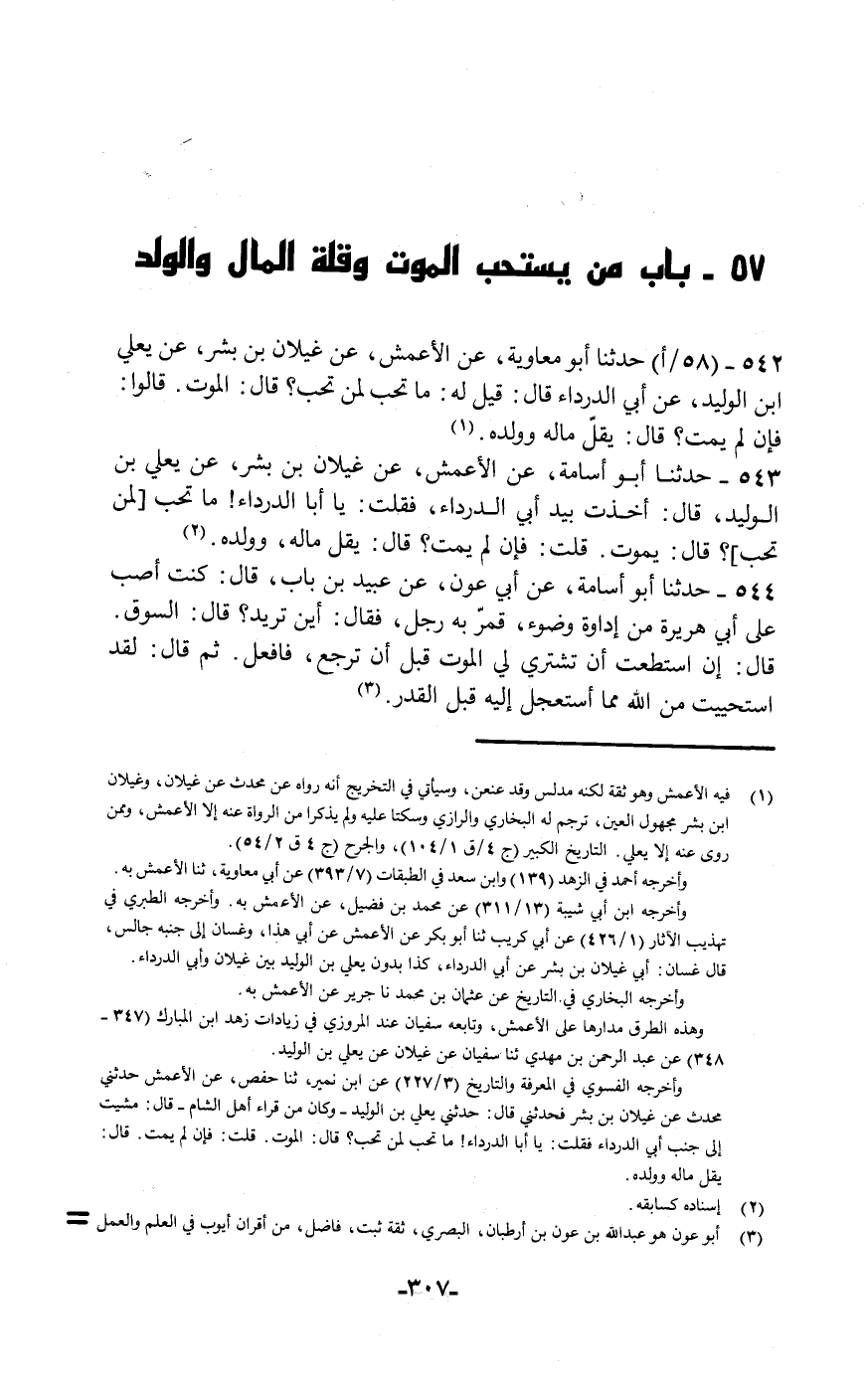 543 - حَدَّثَنَا أَبُو أُسَامَةَ , عَنِ الْأَعْمَشِ , عَنْ غَيْلَانَ بْنِ بِشْرٍ , عَنْ يَعْلَى بْنِ الْوَلِيدِ قَالَ: أَخَذْتُ بِيَدِ أَبِي الدَّرْدَاءِ فَقُلْتُ: يَا أَبَا الدَّرْدَاءِ §مَا تُحِبُّ لِمَنْ تُحِبُّ؟ قَالَ: «يَمُوتُ» , قُلْتُ: فَإِنْ لَمْ يَمُتْ؟ قَالَ: «يَقِلُّ مَالُهُ وَوَلَدُهُ»